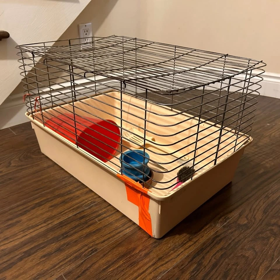 Beige cage (15.5” H × 20.5” L × 16.5” W) — well-used but perfect as a temporary holding cage while cleaning, a travel cage, or a hospital/isolation cage.