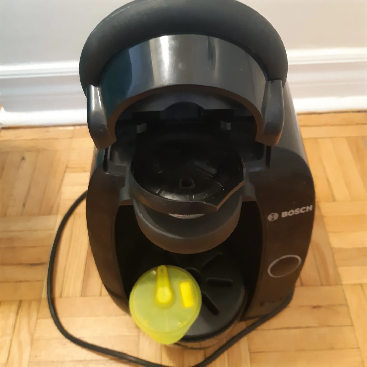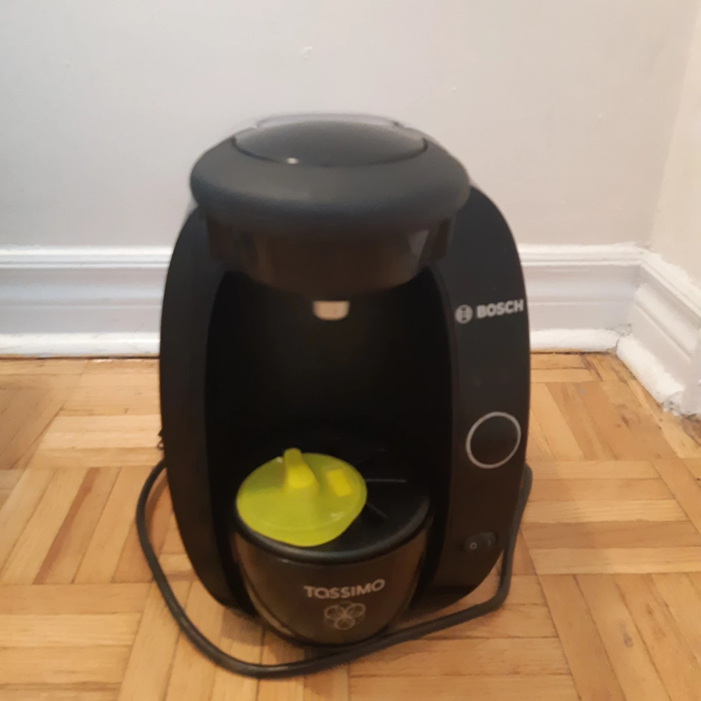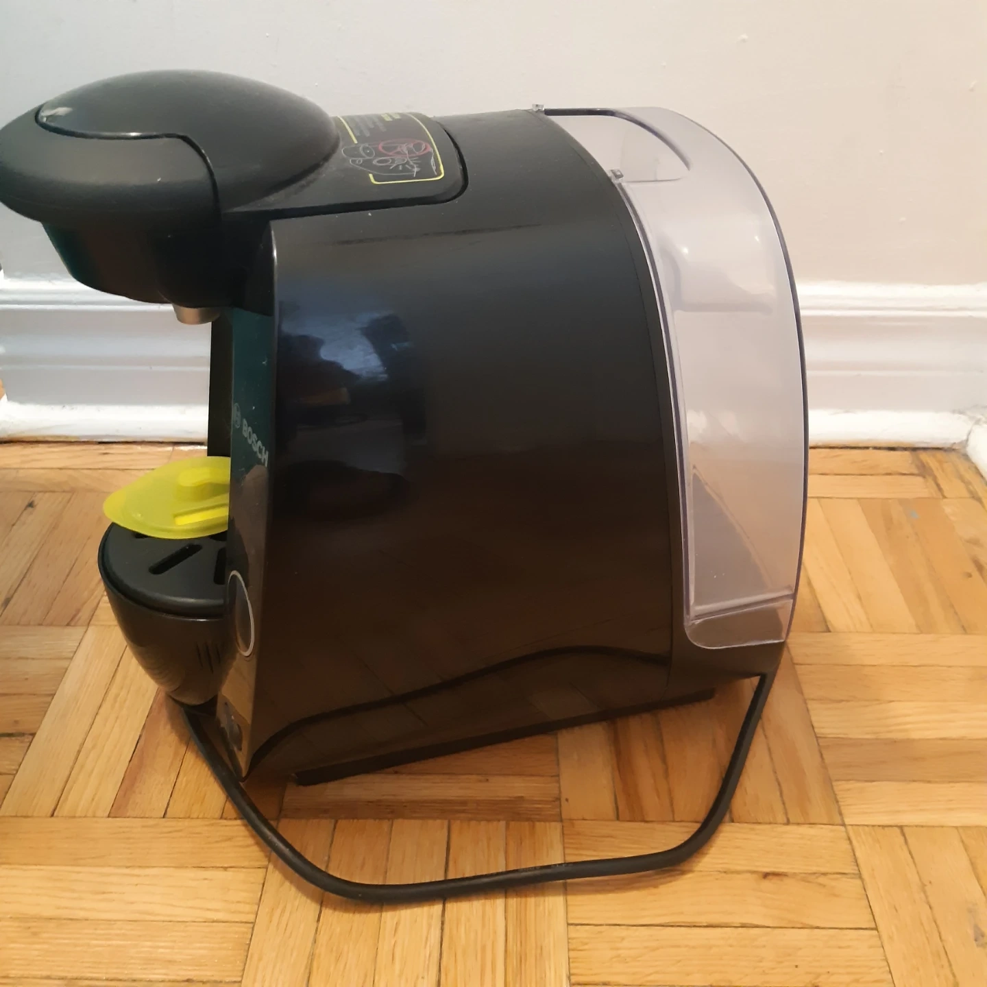 This is a black Bosch Tassimo coffee maker. It's a compact machine perfect for small kitchens. Easy to use for your morning brew!