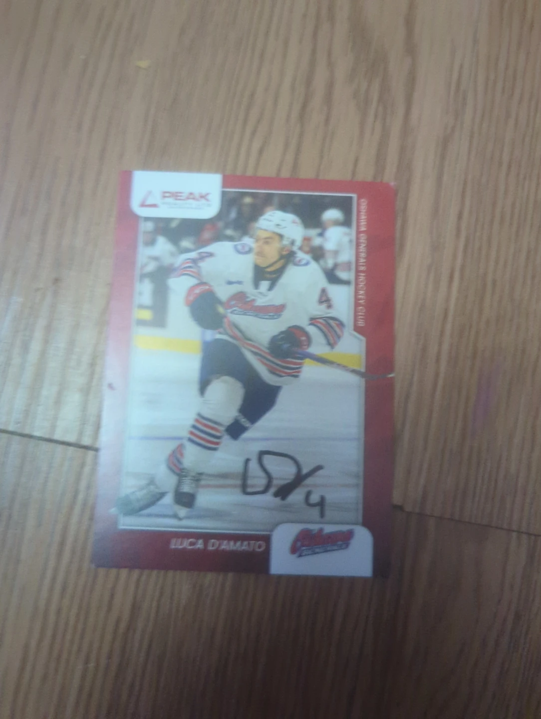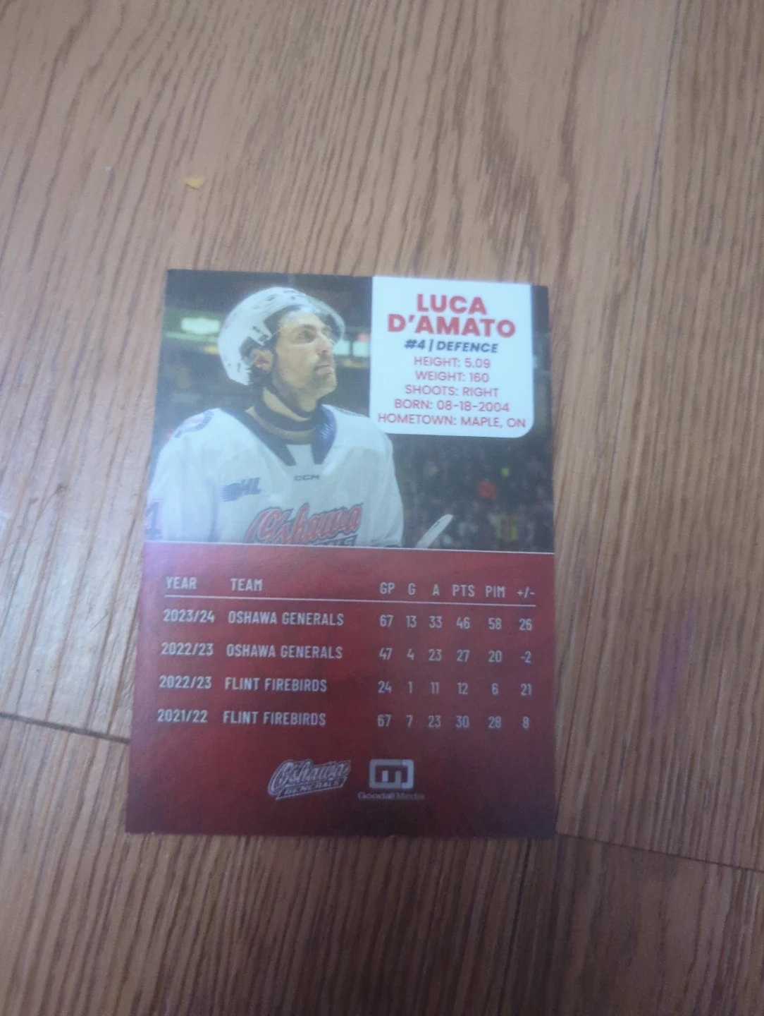Selling a Oshawa generals SIGNED Luca D'Amato hockey card. It features stats and information about the player and team.