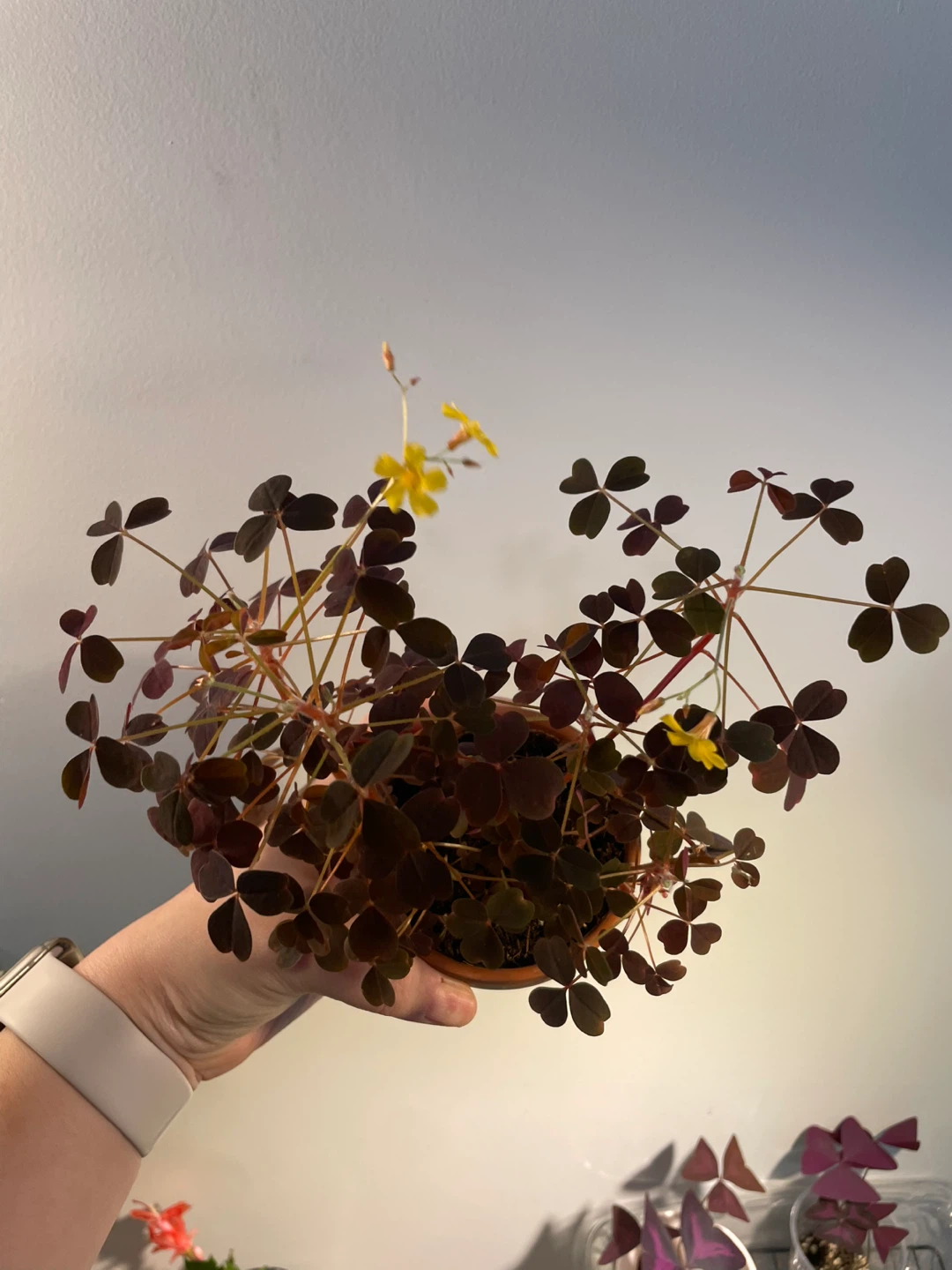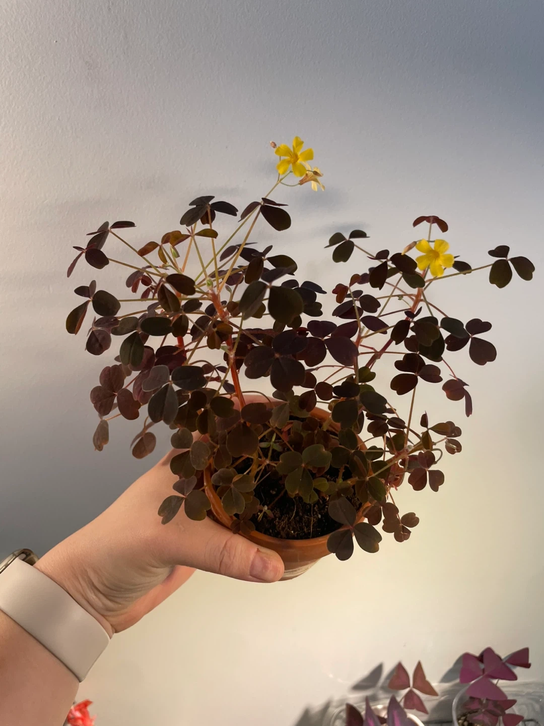 Selling a lovely Oxalis Triangularis plant! This plant features beautiful, dark purple leaves that resemble butterflies, and it occasionally blooms with delicate yellow flowers. It's a unique and eye-catching addition to any indoor space