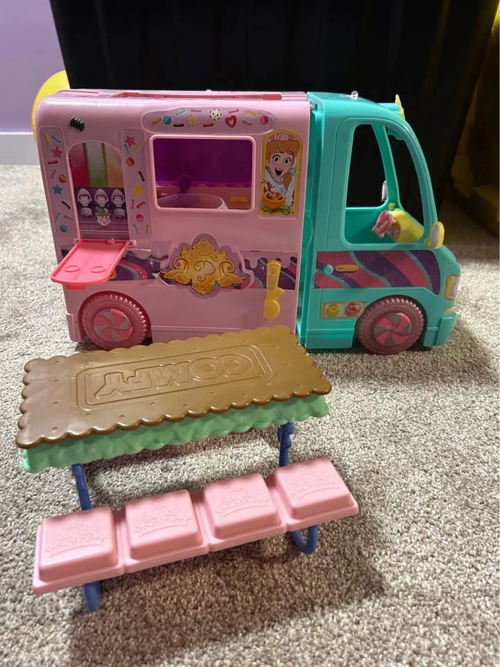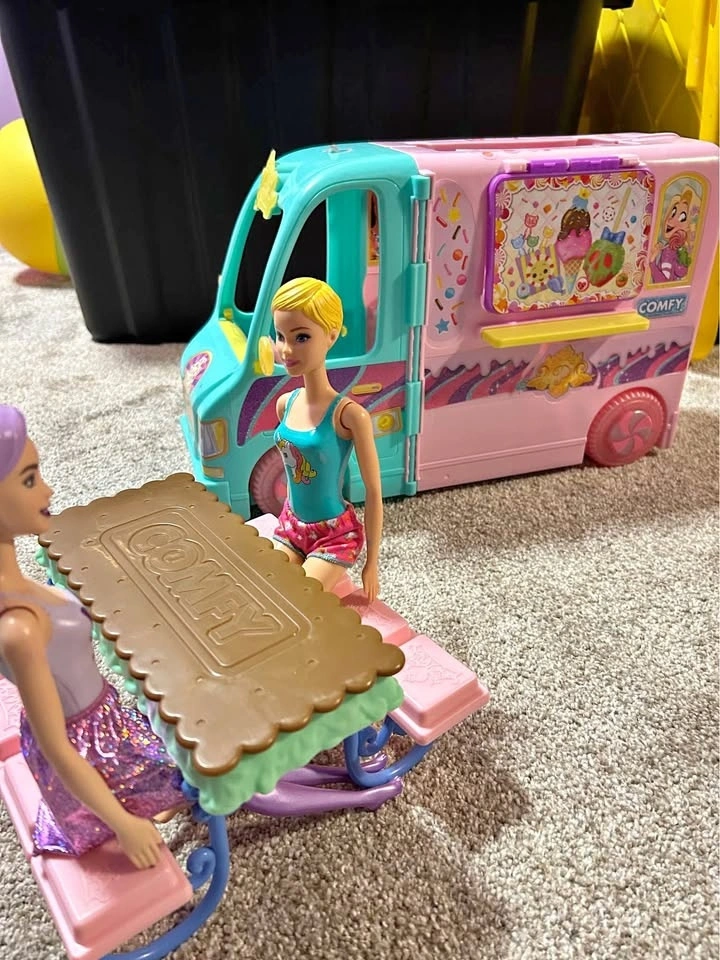 Barbie ice cream truck and picnic table. This is in great condition and has not been used a lot. It also comes with two Barbies that you see in the picture.