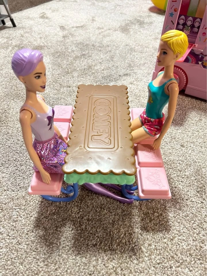 Barbie ice cream truck and picnic table. This is in great condition and has not been used a lot. It also comes with two Barbies that you see in the picture.
