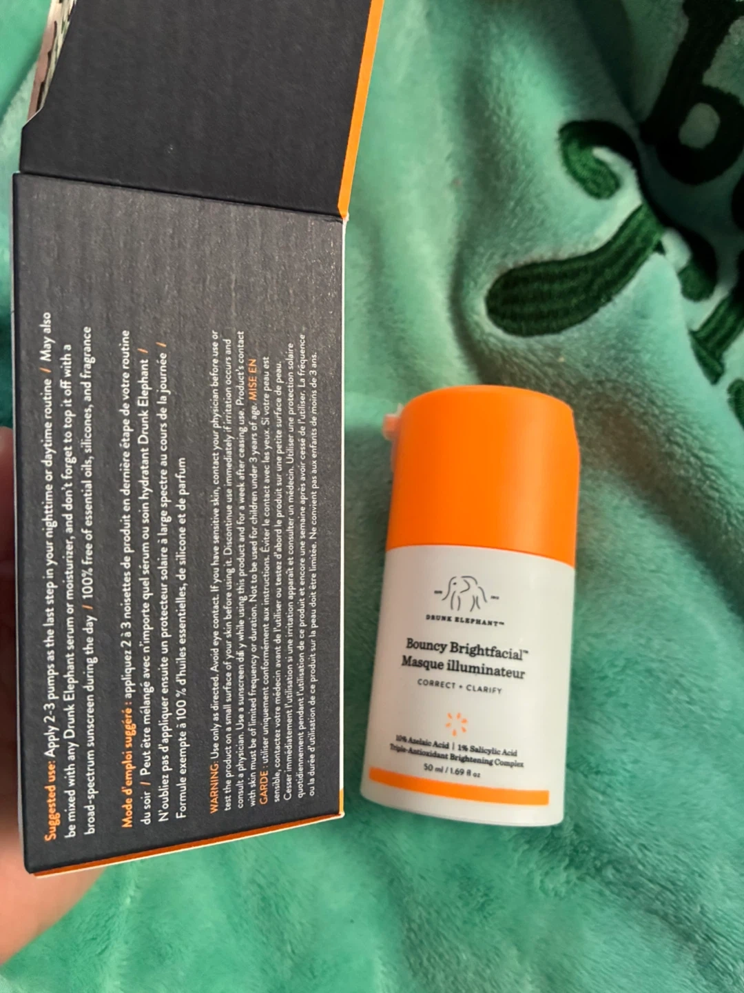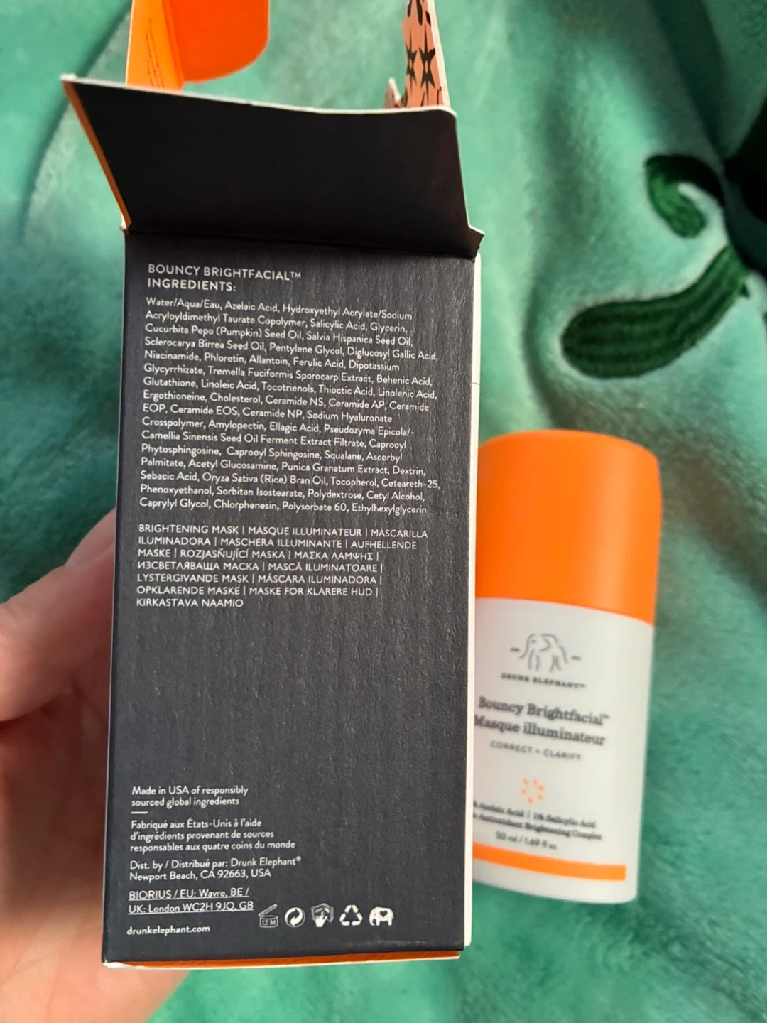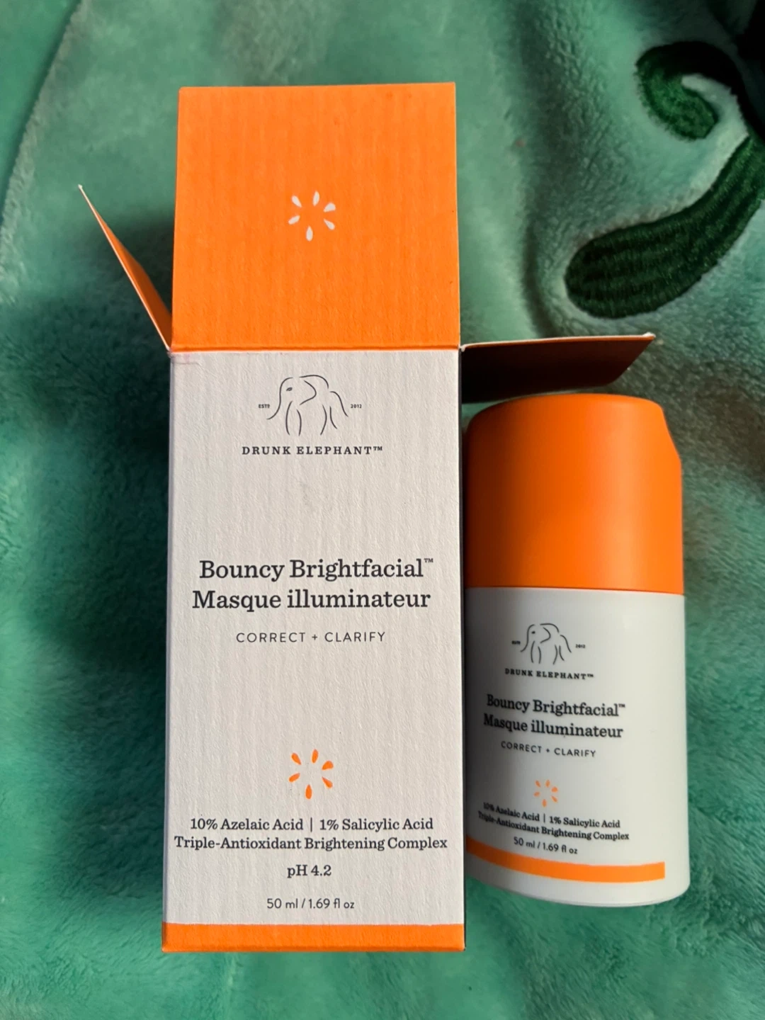 Selling a Drunk Elephant Bouncy Brightfacial Masque Illuminateur! It comes with its original box. This masque contains 10% Azelaic Acid and 1% Salicylic Acid. It's a triple-antioxidant brightening complex with a pH of 4.2. It comes in a 50 ml / 1.69 fl oz container.