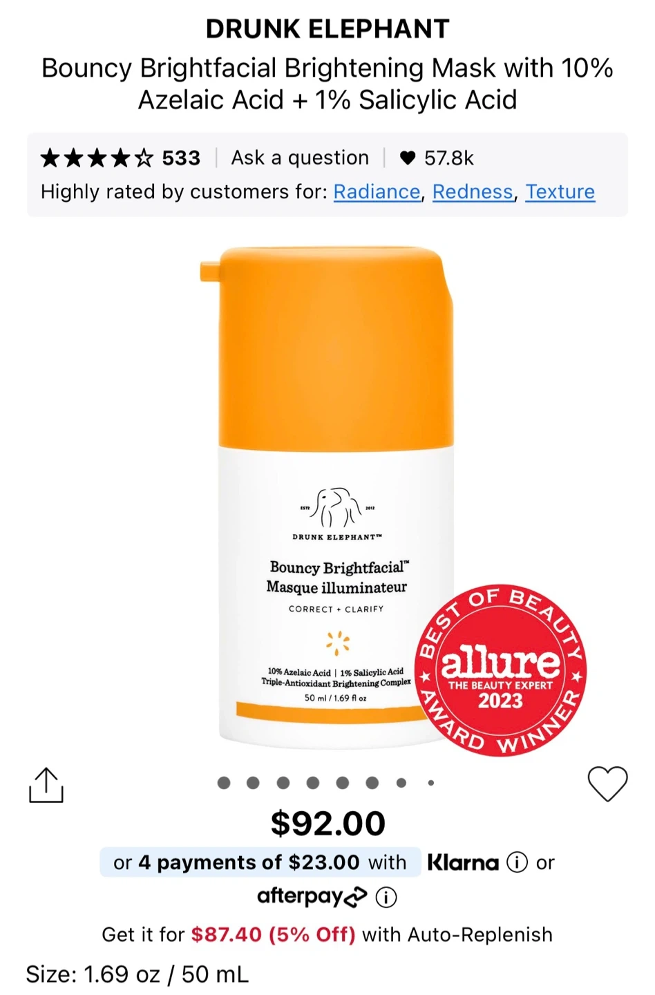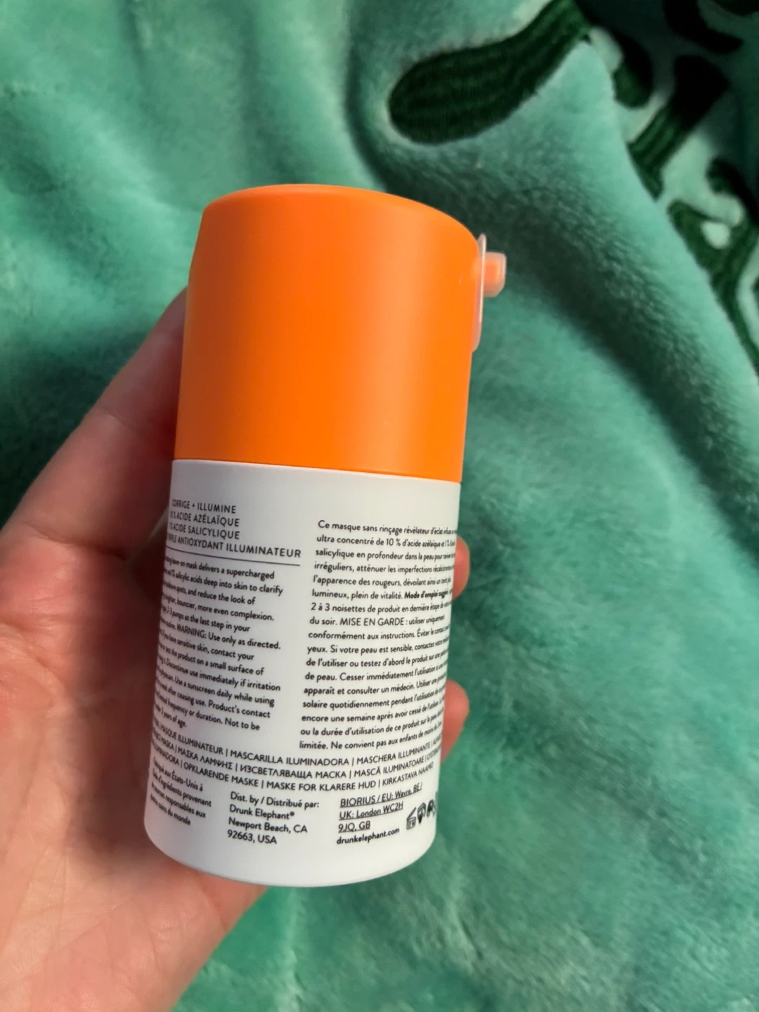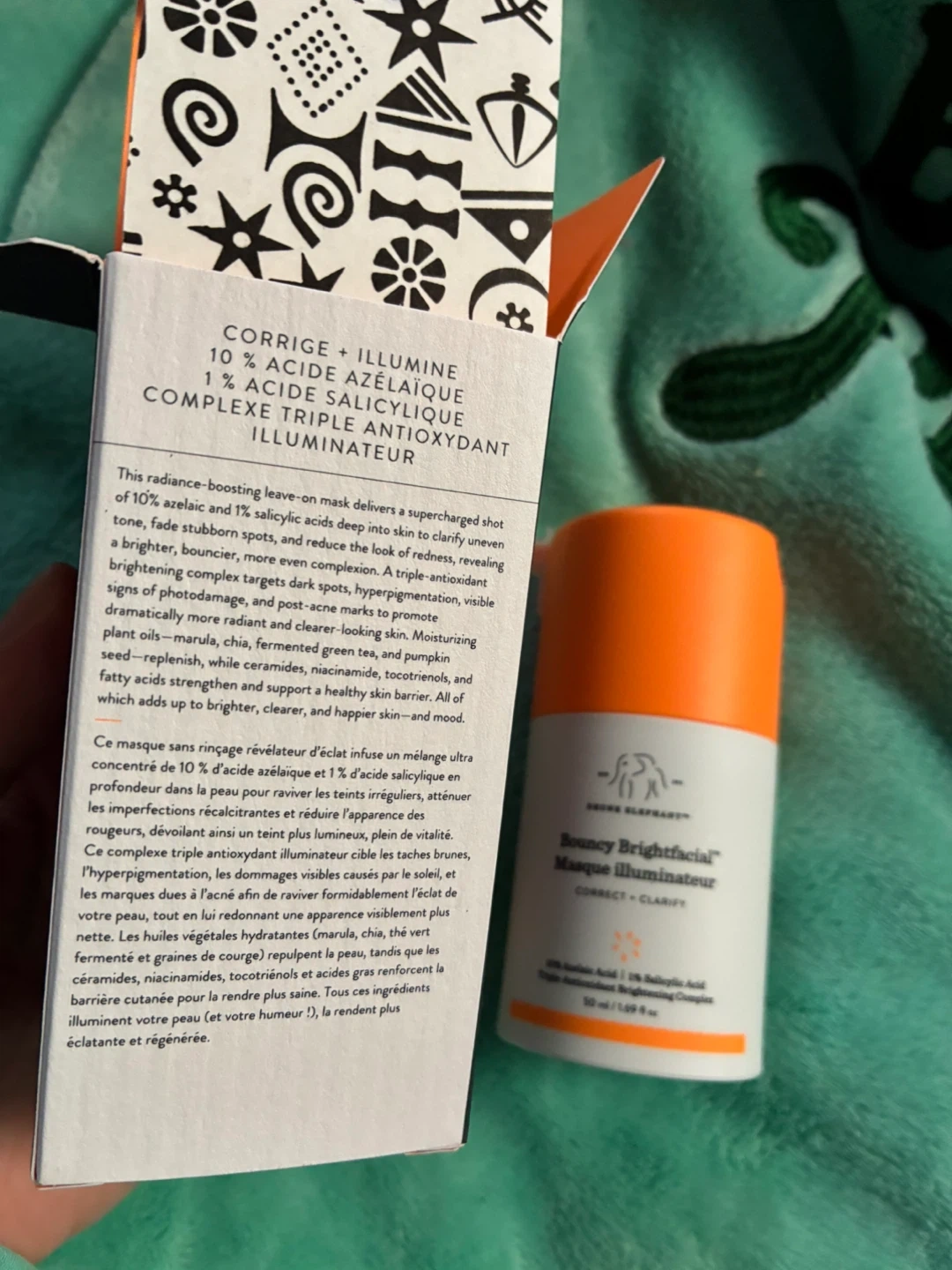 Selling a Drunk Elephant Bouncy Brightfacial Masque Illuminateur! It comes with its original box. This masque contains 10% Azelaic Acid and 1% Salicylic Acid. It's a triple-antioxidant brightening complex with a pH of 4.2. It comes in a 50 ml / 1.69 fl oz container.