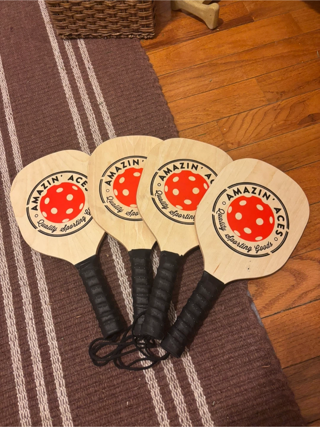 Selling a set of four Amazin' Aces pickleball paddles! They're in great shape and ready for some fun on the court. The paddles feature a black grip and the Amazin' Aces logo.