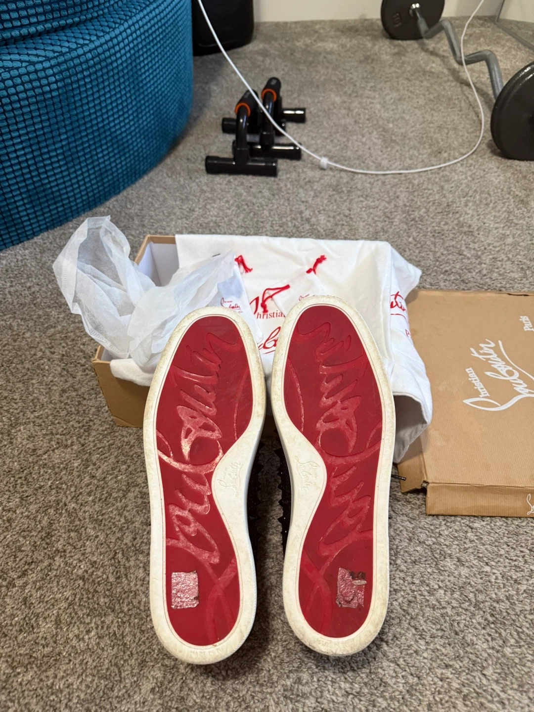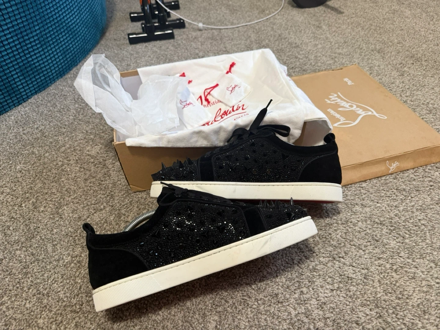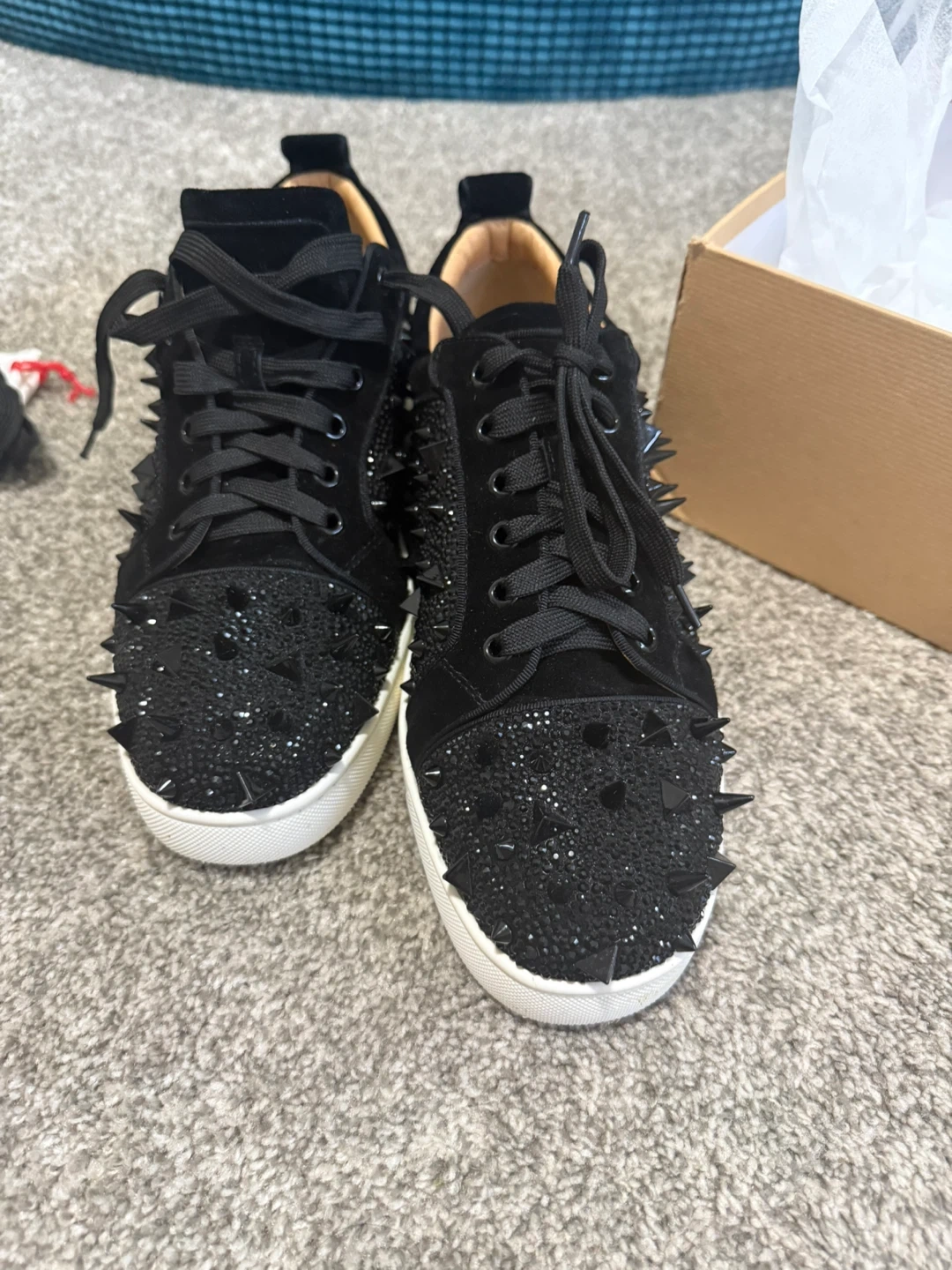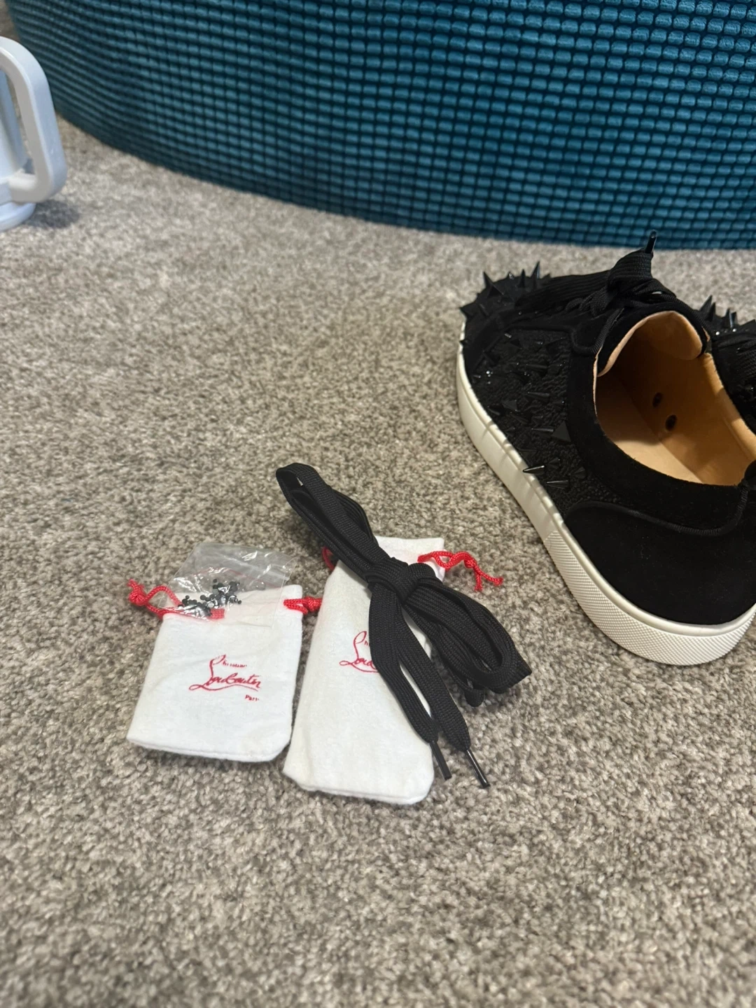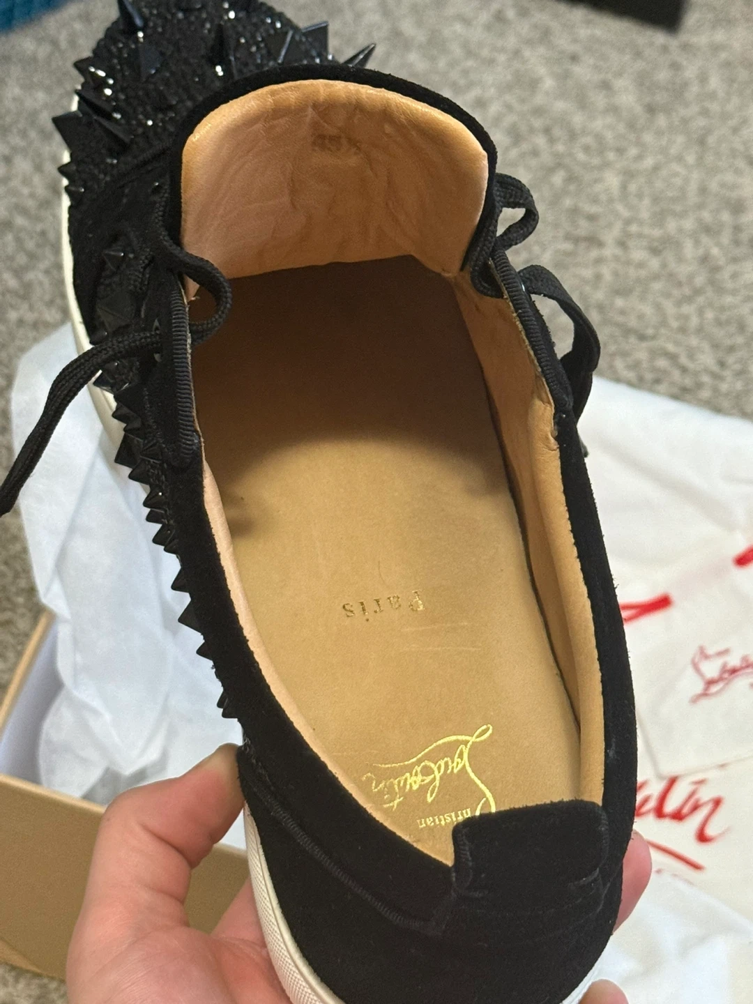 Selling a pair of Christian Louboutin black spike sneakers. They come with the original box and dust bags. The soles are the signature Louboutin red. These shoes are immaculate, only worn to grad once 5 years ago. Size 45.5, so a us 11.5. I’m size 11 and I’m able to wear comfortably small bit of wiggle room at the toes, but not excessive. Top lid of box came off while moving and got flattened, but that would be the only flaw. Message for more info if need be.