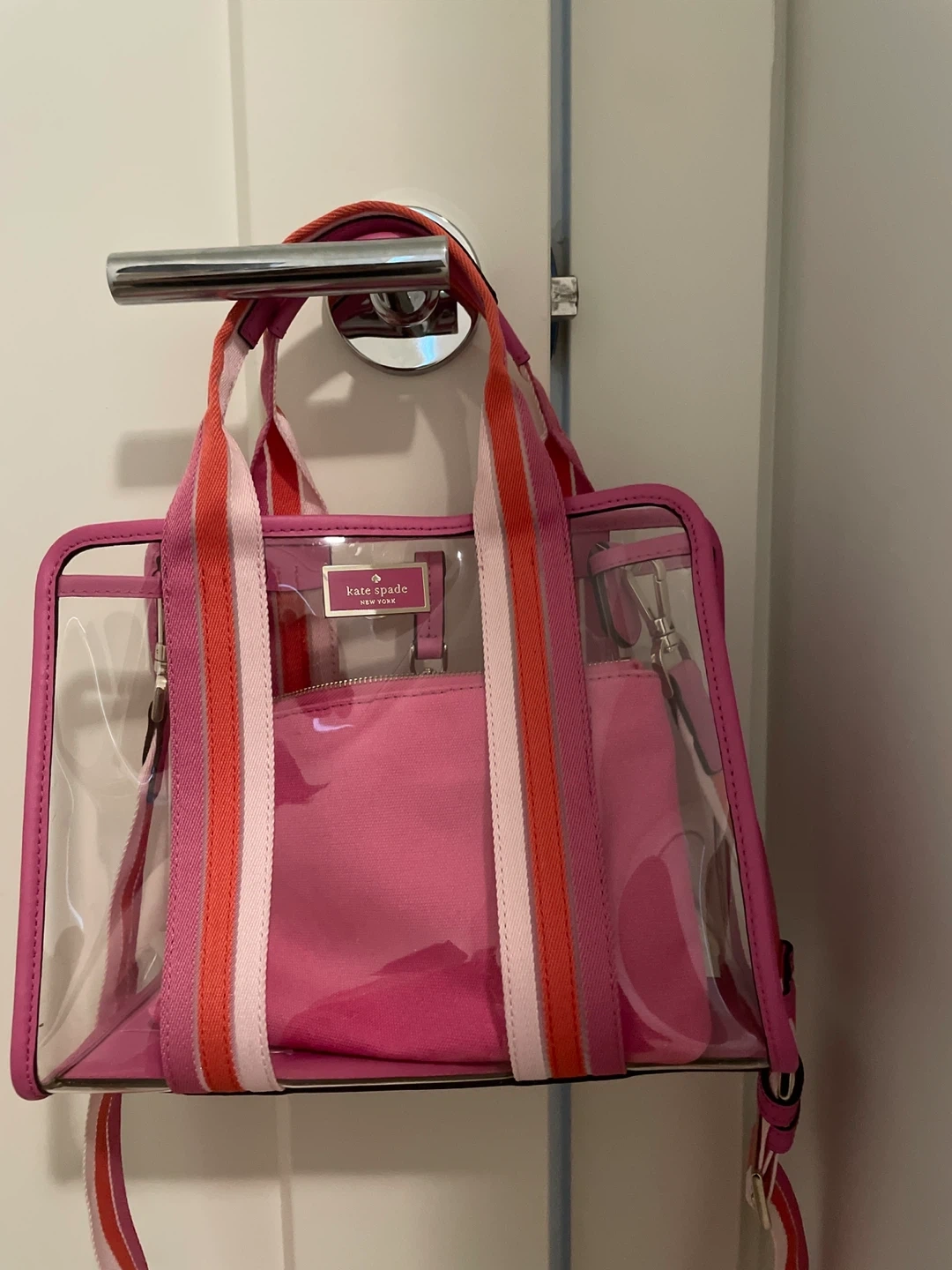 Selling a cute Kate Spade tote bag! It's a clear tote with pink accents and striped straps. Perfect for adding a pop of colour to your outfit!