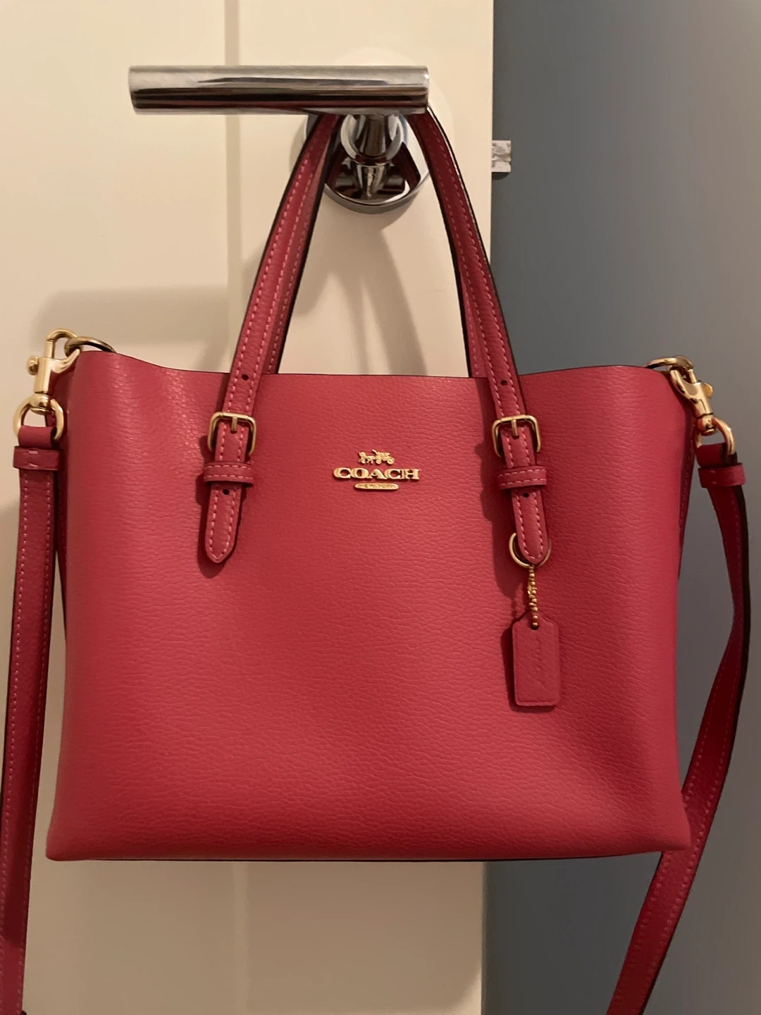 Selling a beautiful Coach handbag in a lovely shade of pink. It's made of leather and has a detachable shoulder strap. Perfect for everyday use!