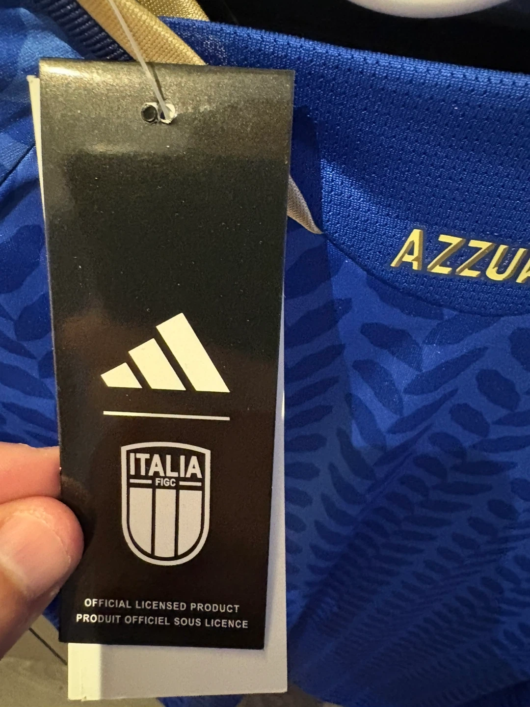 Selling an Adidas Italy soccer jersey in blue! It features the Italian flag emblem and Adidas logo. The jersey has a stylish leaf pattern and gold accents on the shoulders and collar.