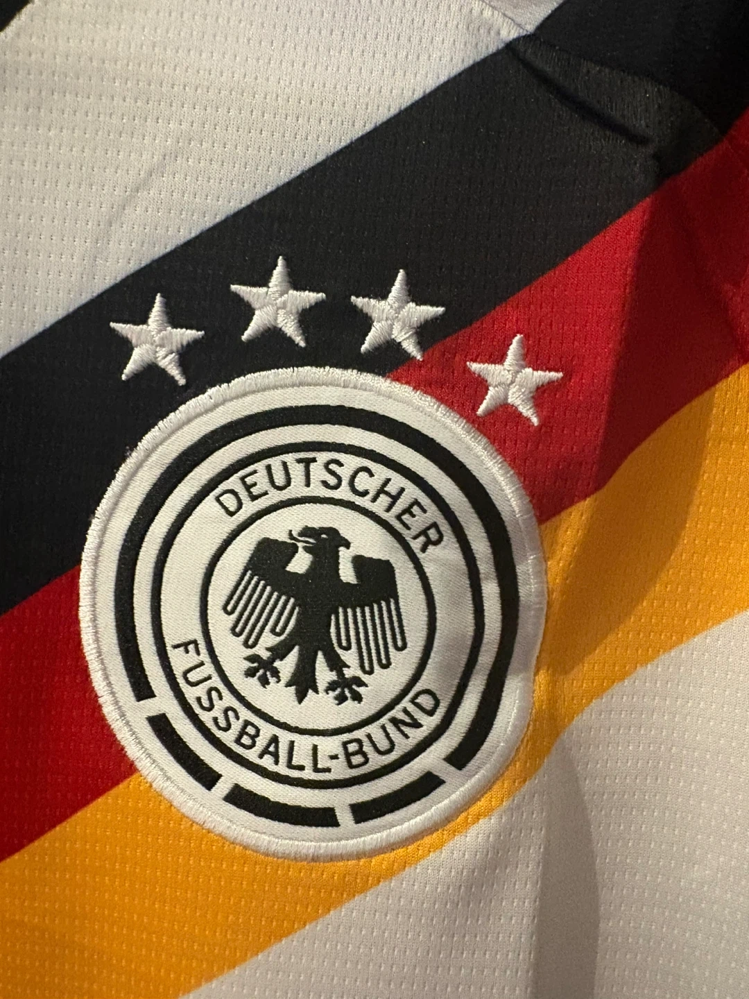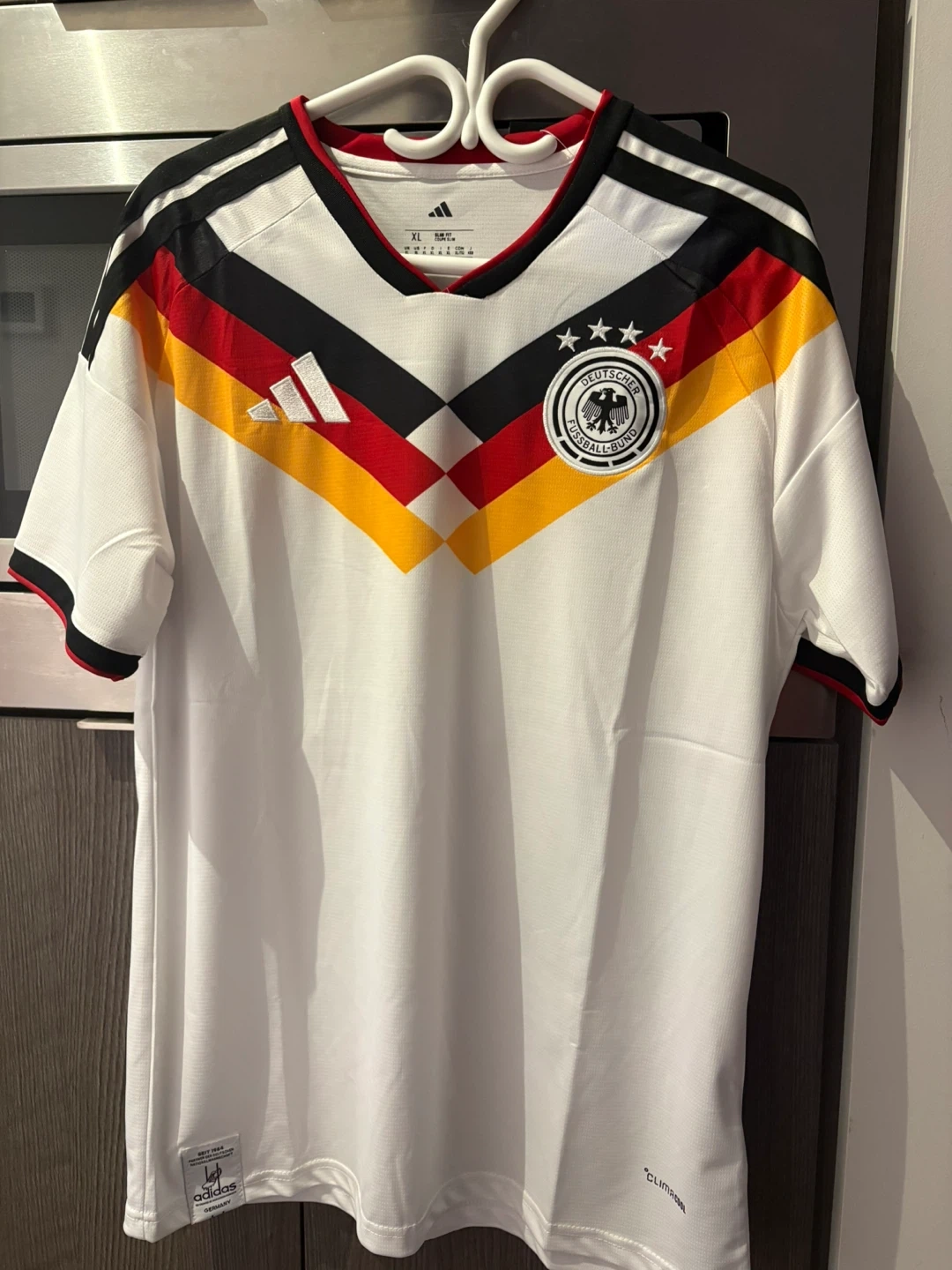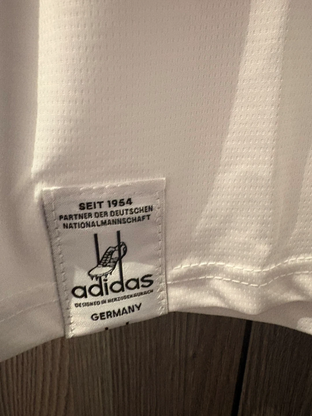 Selling an Adidas Germany soccer jersey. The jersey features the Deutscher Fussball-Bund logo and the iconic Adidas stripes. Perfect for any soccer fan!