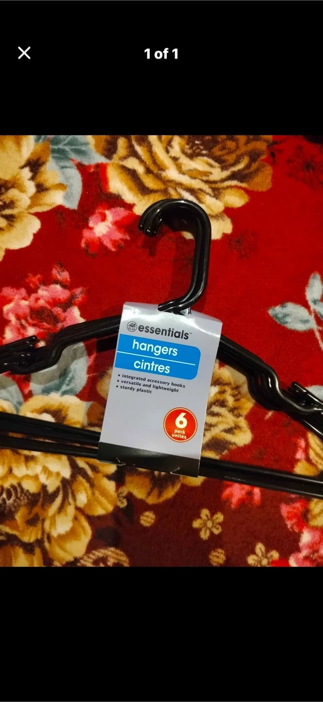 Selling a pack of 6 black hangers from Essentials! They feature integrated accessory hooks and are made of sturdy plastic. They are also versatile and lightweight, perfect for any closet