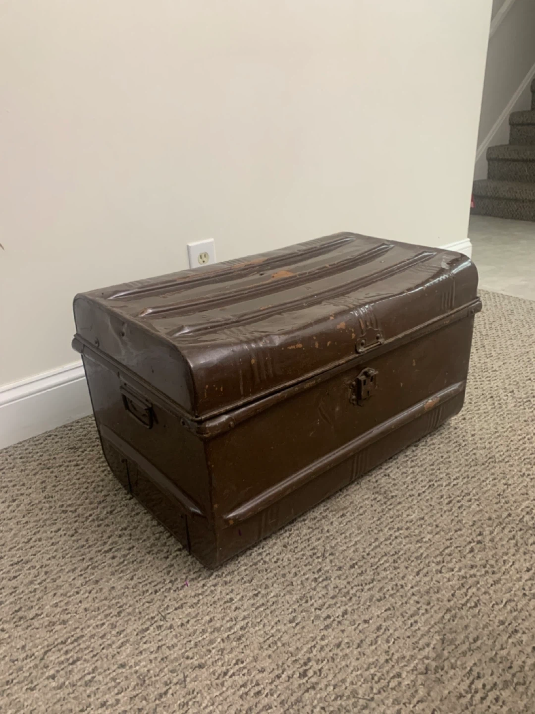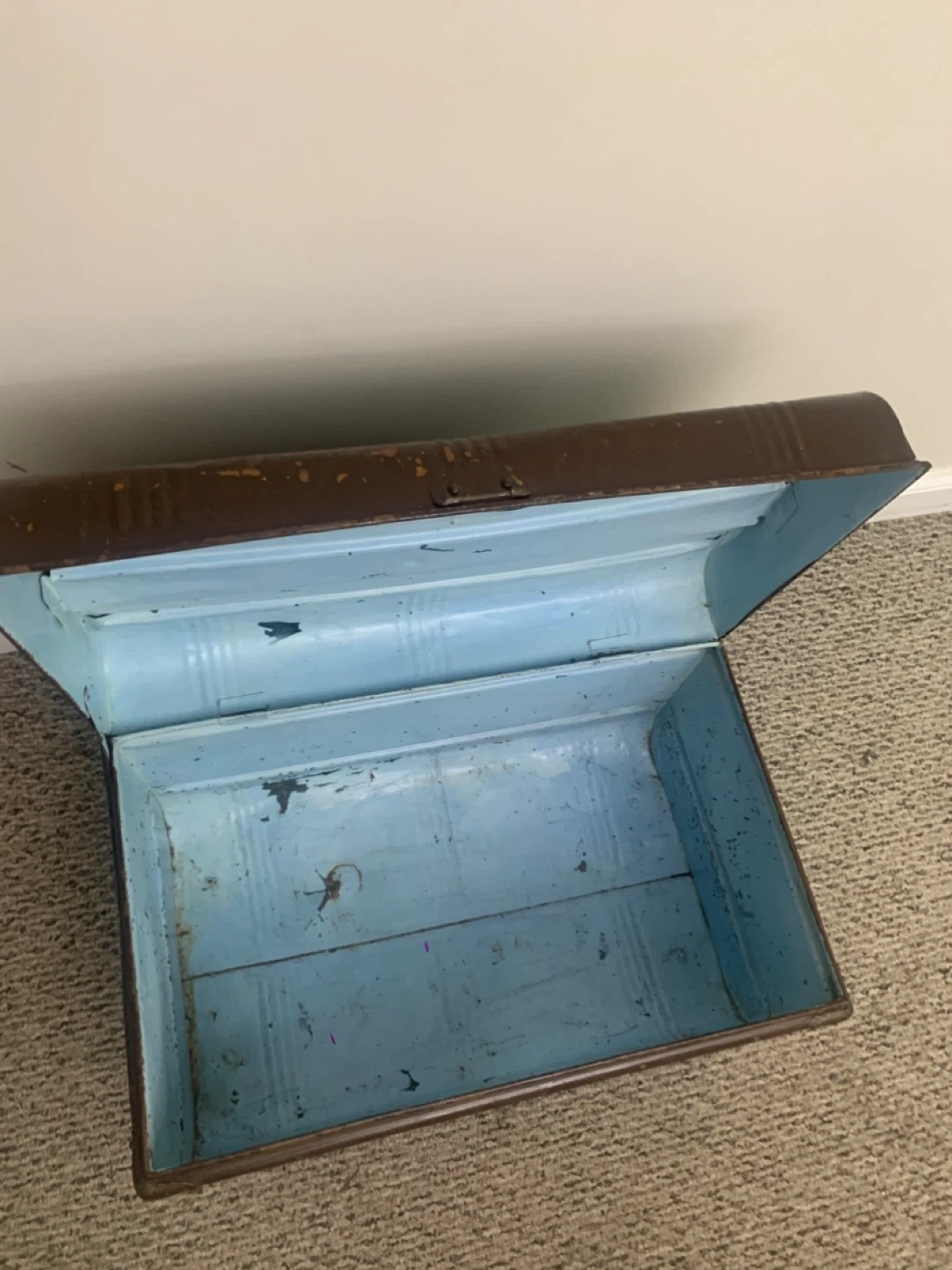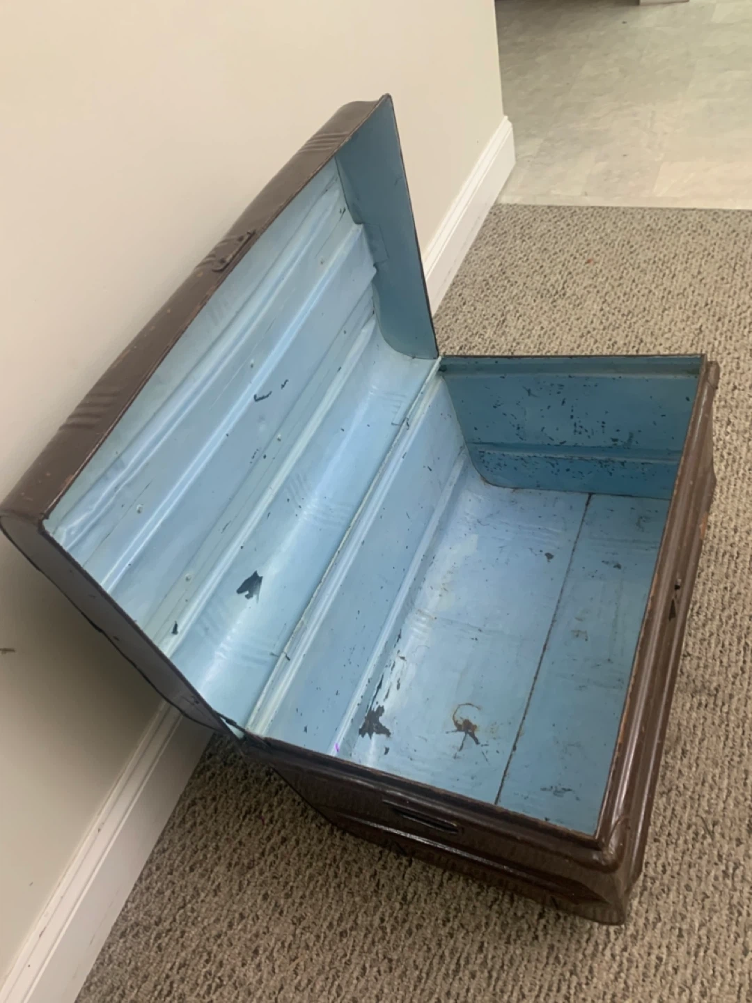 Selling a vintage metal trunk! It's brown on the outside and light blue on the inside. It has some signs of wear and tear, but it's still in good condition for its age. Perfect for storage or as a decorative piece!