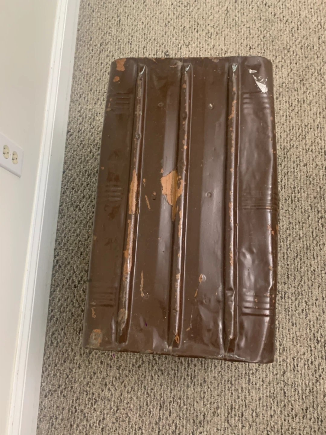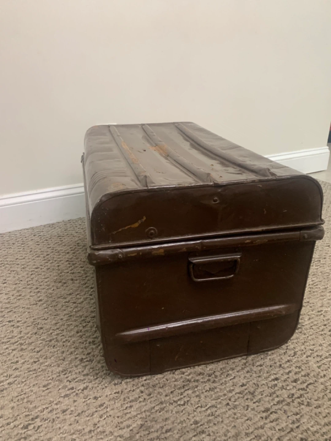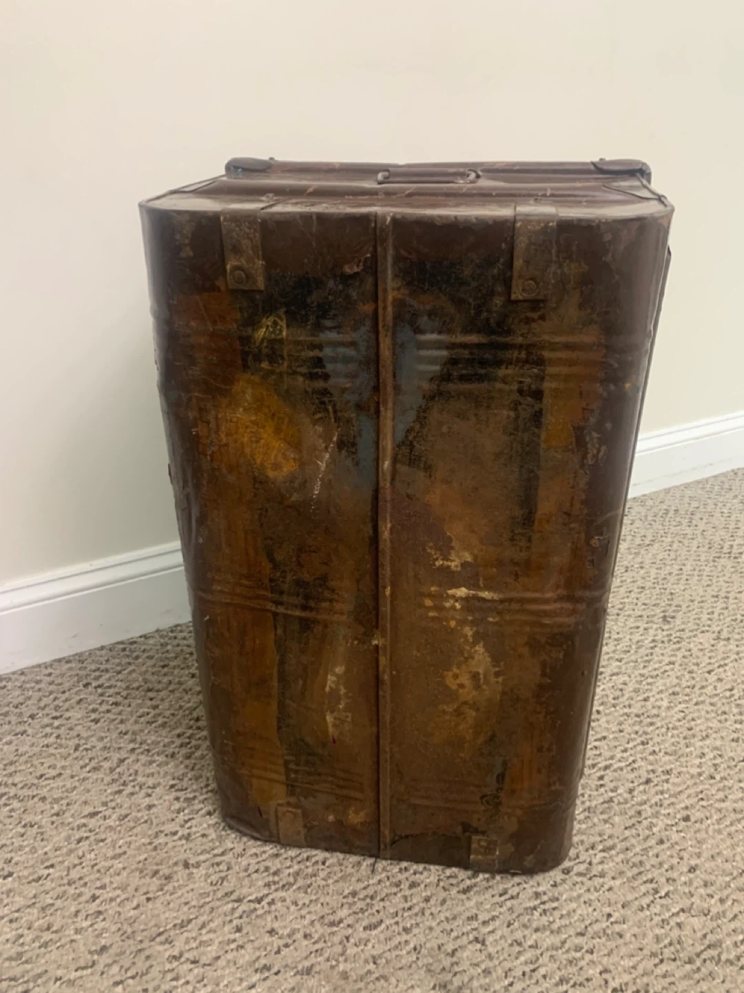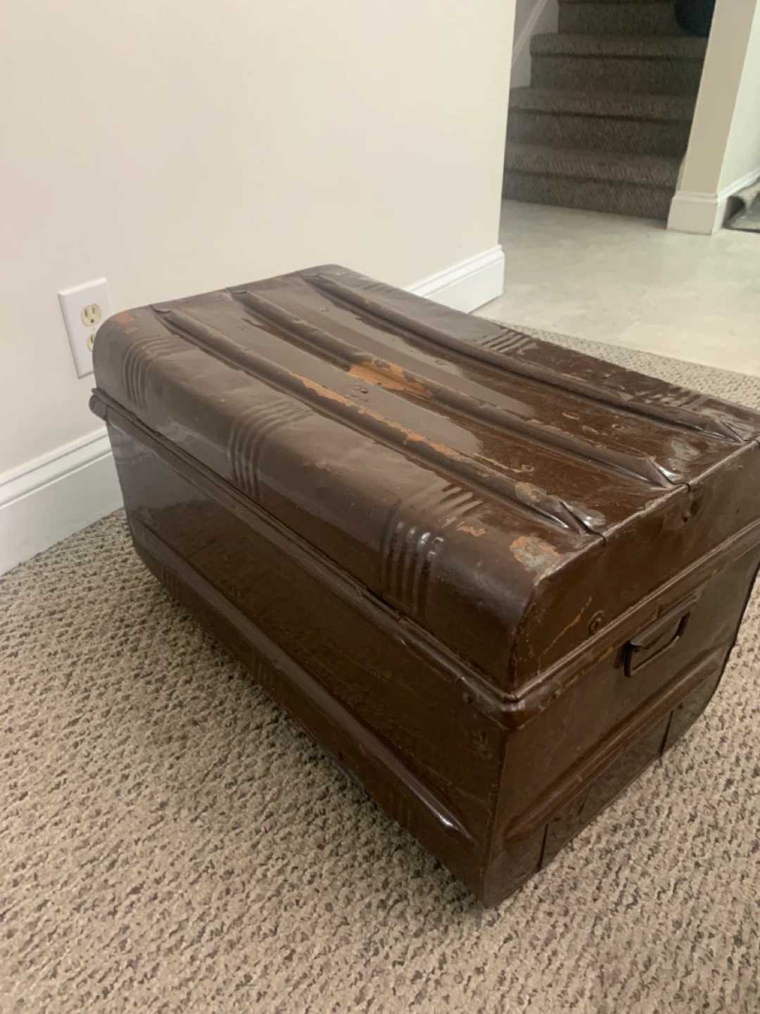 Selling a vintage metal trunk! It's brown on the outside and light blue on the inside. It has some signs of wear and tear, but it's still in good condition for its age. Perfect for storage or as a decorative piece!