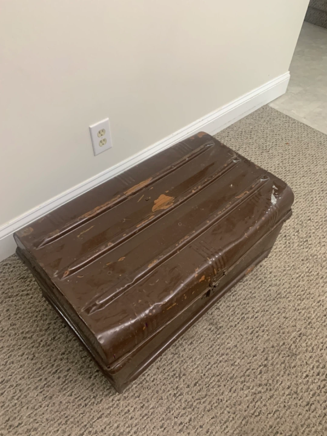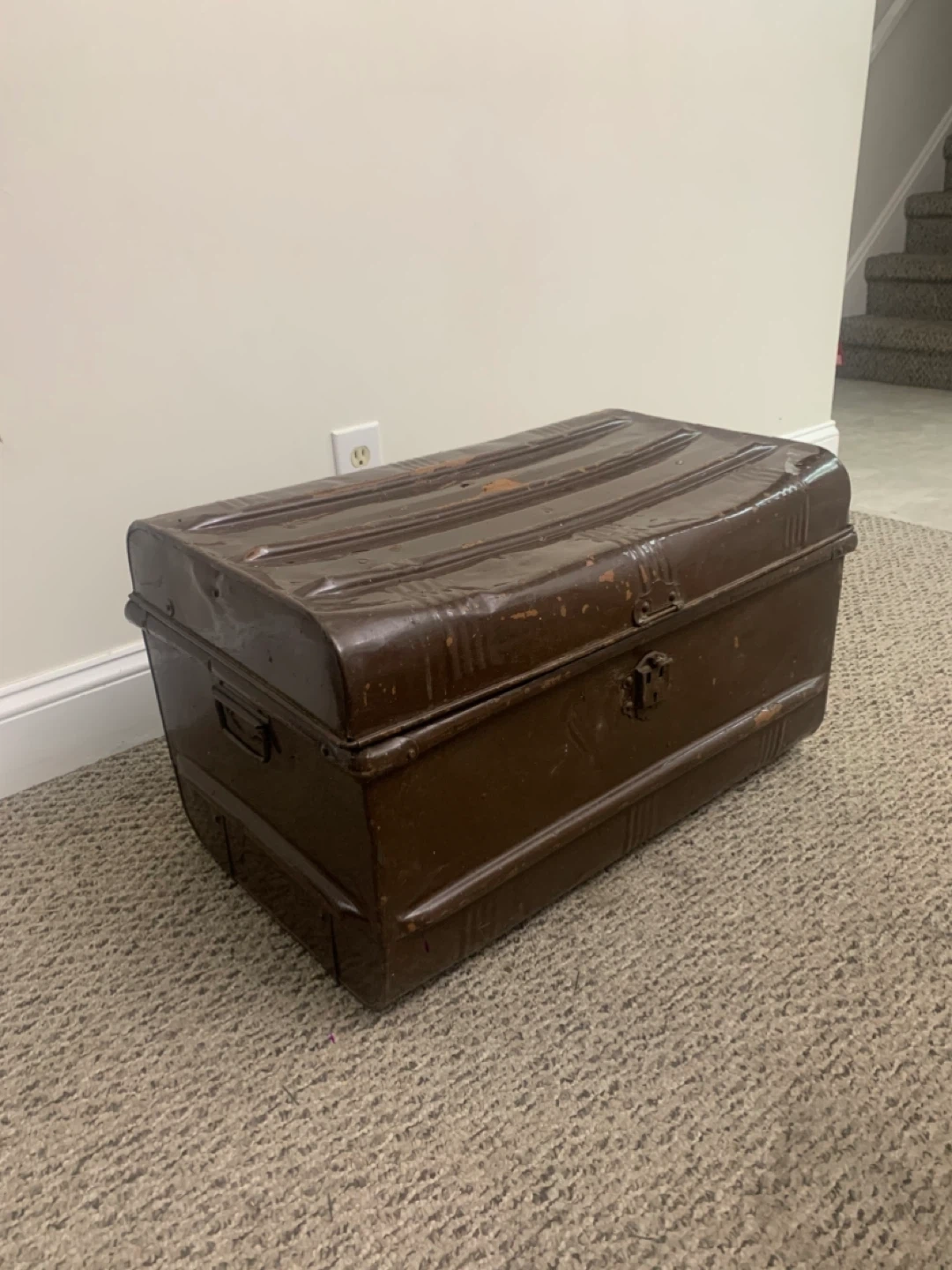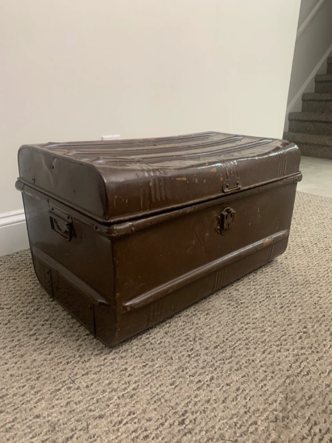 Selling a vintage metal trunk! It's brown on the outside and light blue on the inside. It has some signs of wear and tear, but it's still in good condition for its age. Perfect for storage or as a decorative piece!