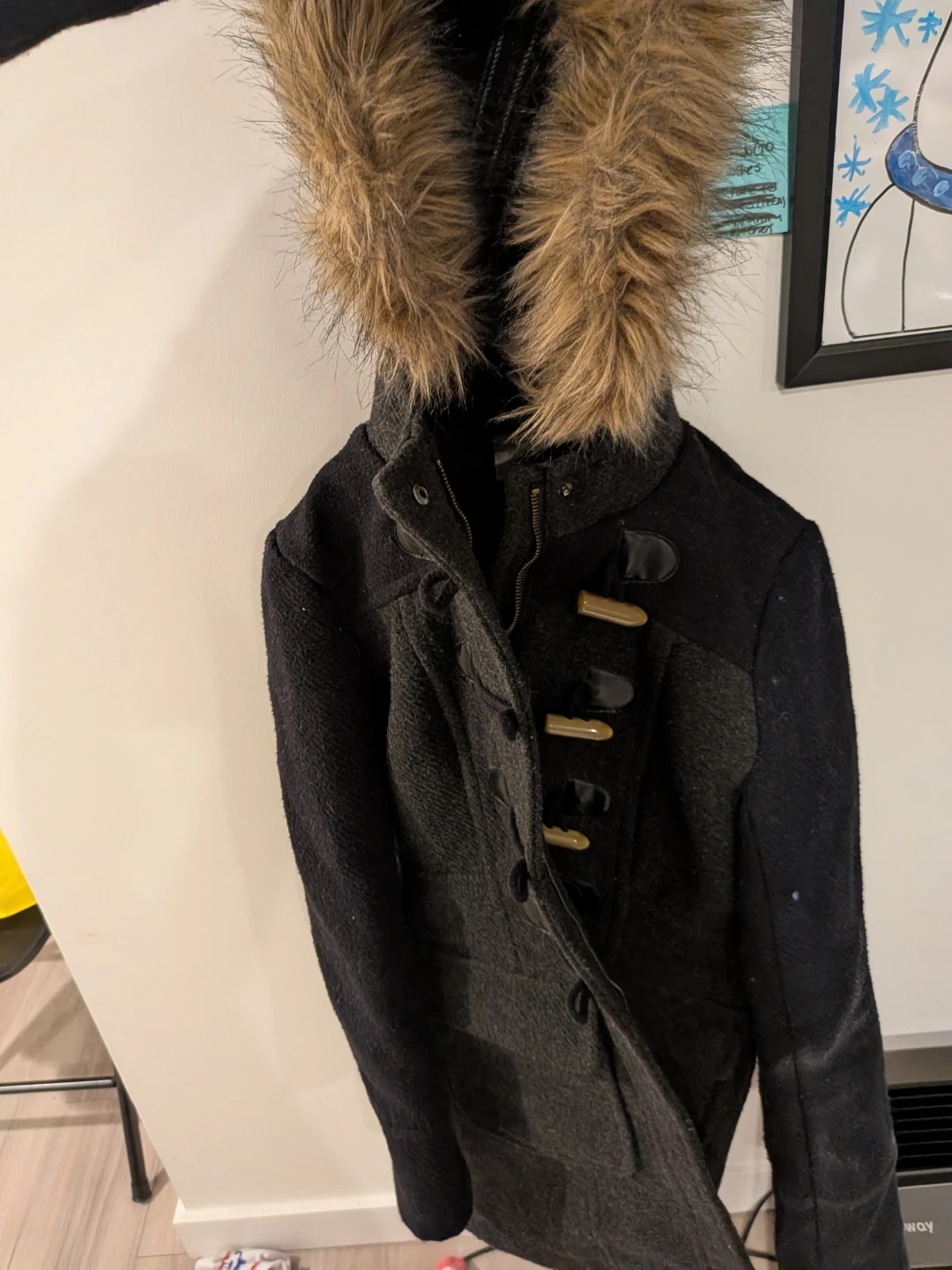 Selling a warm and stylish coat with a fur-trimmed hood! It's perfect for those chilly Canadian days. This coat is in great condition and ready for a new owner. It's a great addition to any winter wardrobe