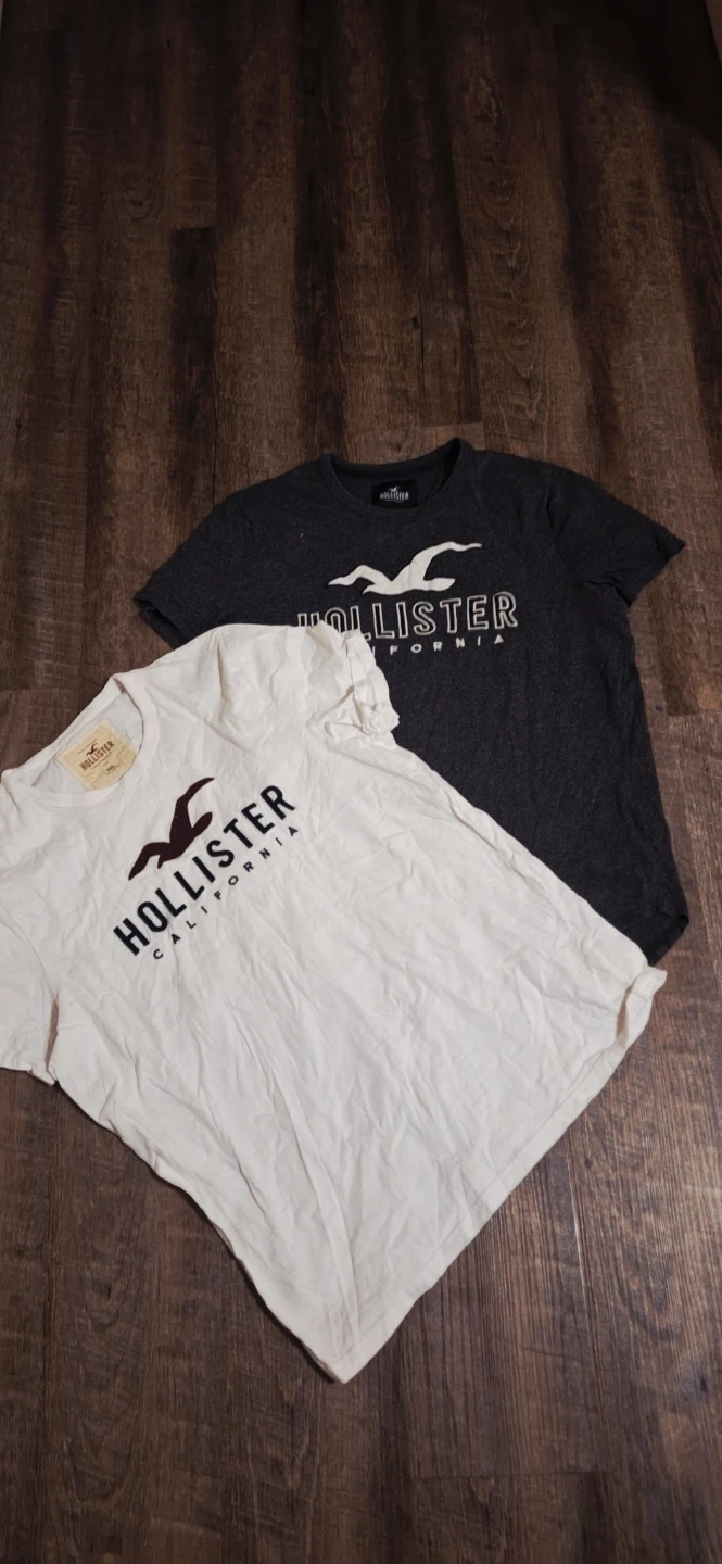 Two Hollister t-shirts for sale! One is white with the Hollister California logo, and the other is a dark grey with the Hollister logo. Both are in good condition and ready for a new wardrobe