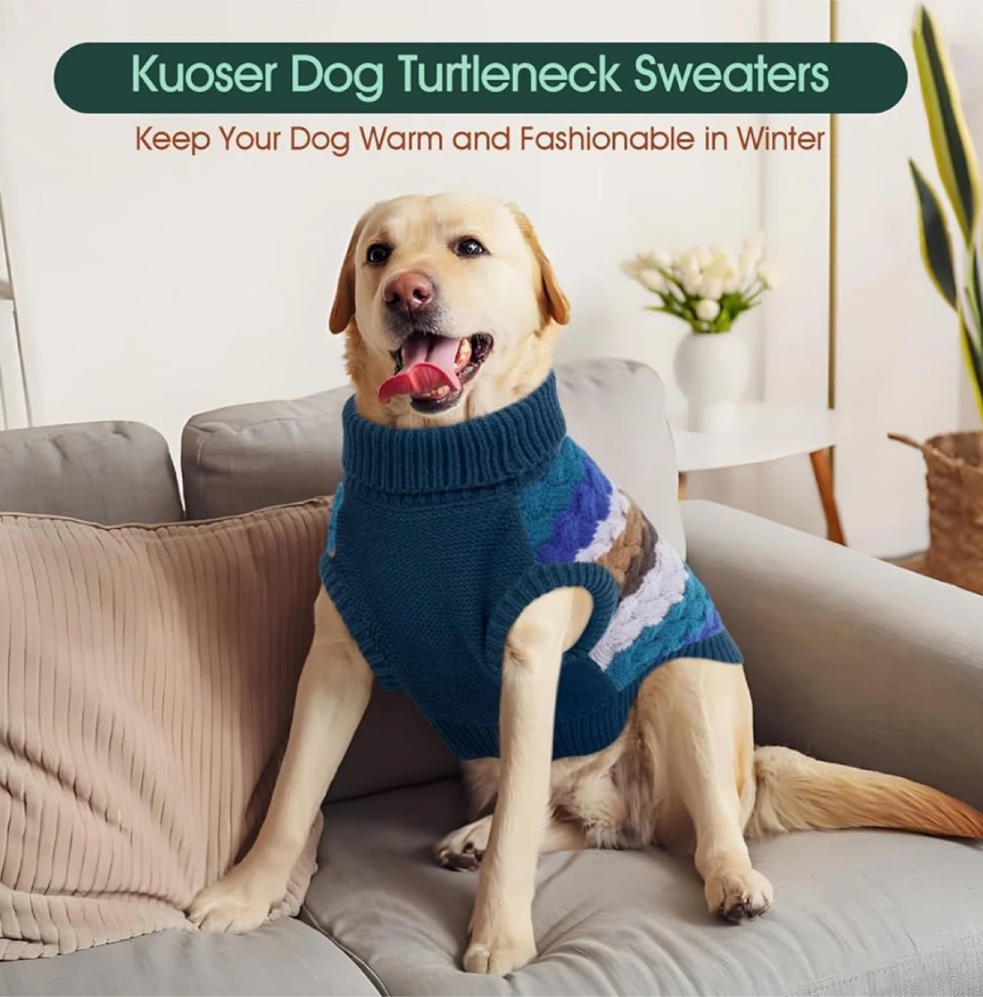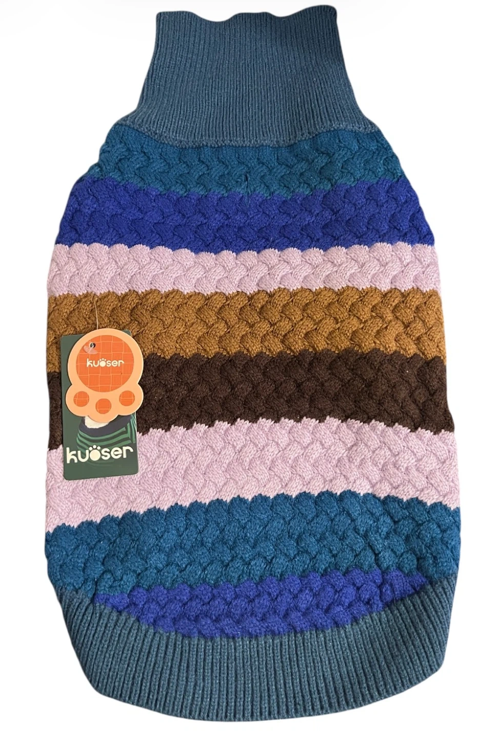 Cozy, stylish dog sweater by Kuoser with a classic cable-knit design. Soft, stretchy, and warm — perfect for fall and winter walks.