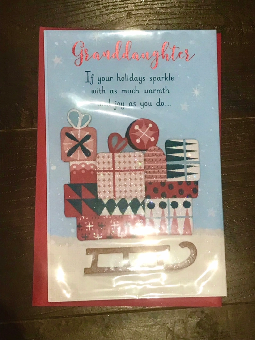 A sweet card for your granddaughter for the holidays! The card features a stack of sparkly presents and a sleigh.