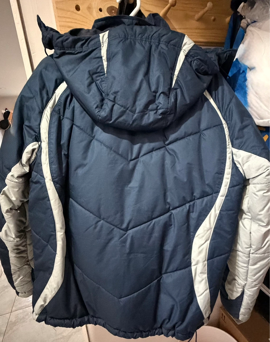 Navy blue puffer jacket with grey accents. Features a full zip and attached hood. NikeFIT technology is incorporated into the design. Perfect for keeping warm on chilly days!