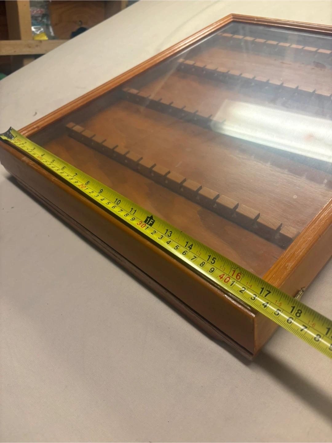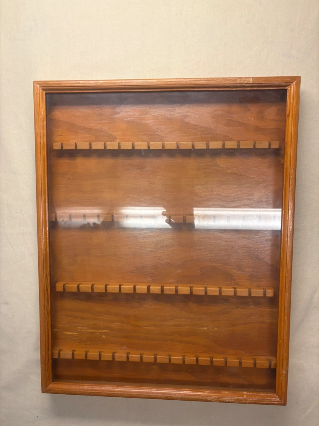 Wooden spoon display case in good condition. It measures approximately 23 inches in length and 20 inches in width. Perfect for displaying your spoon collection!