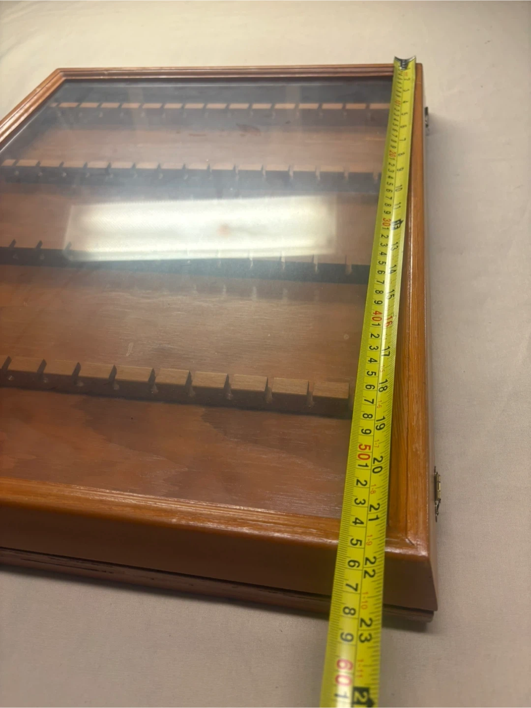 Wooden spoon display case in good condition. It measures approximately 23 inches in length and 20 inches in width. Perfect for displaying your spoon collection!