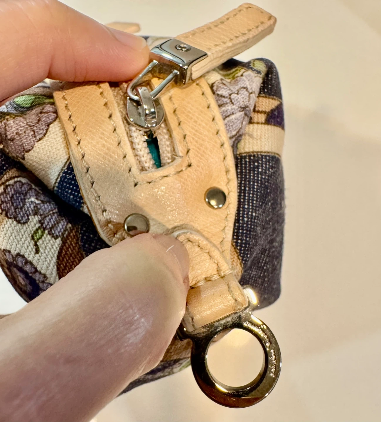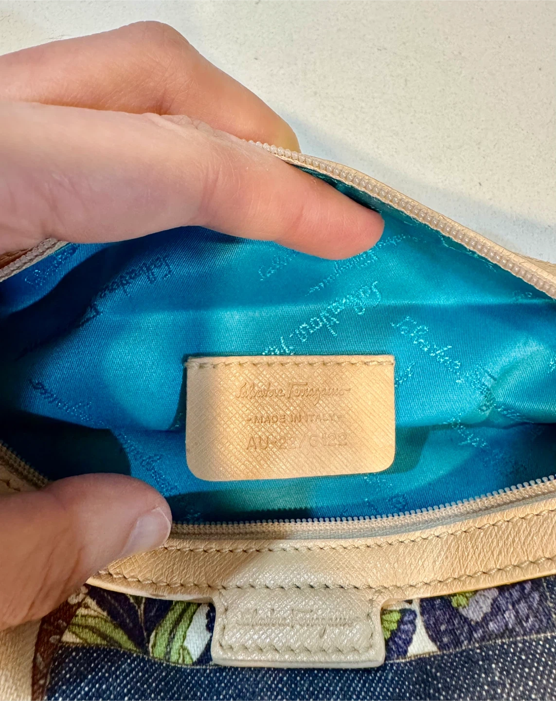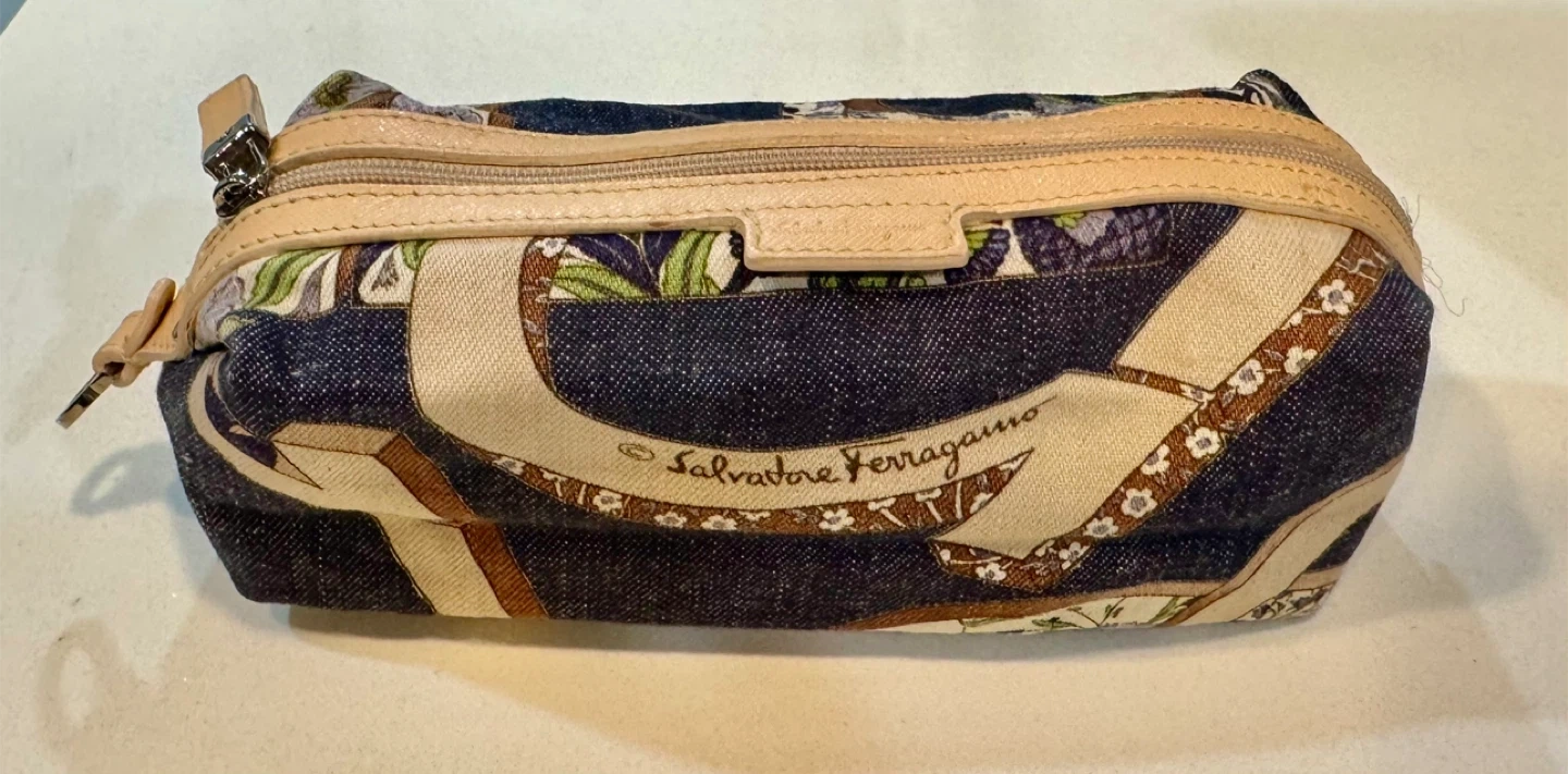 Here's a cute Salvatore Ferragamo pouch! It features a unique floral design on a denim-like material, accented with leather trim. The interior is lined with a vibrant blue fabric. Perfect for keeping your essentials organized!