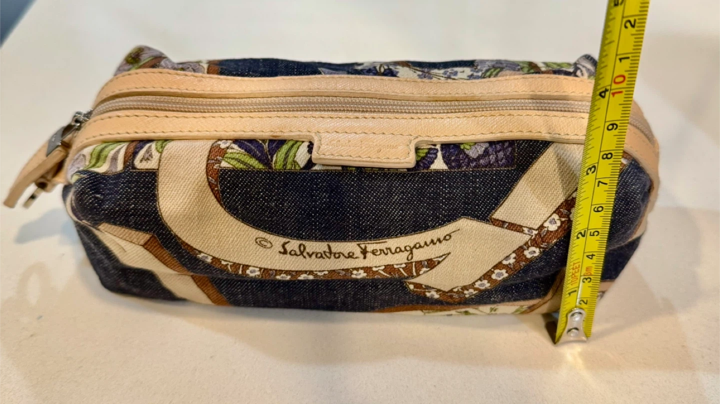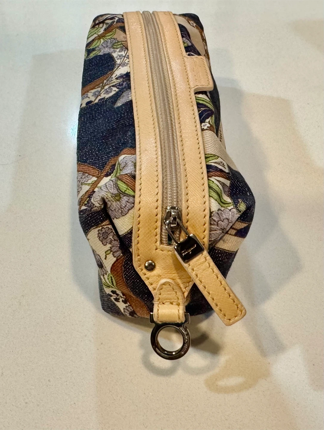 Here's a cute Salvatore Ferragamo pouch! It features a unique floral design on a denim-like material, accented with leather trim. The interior is lined with a vibrant blue fabric. Perfect for keeping your essentials organized!