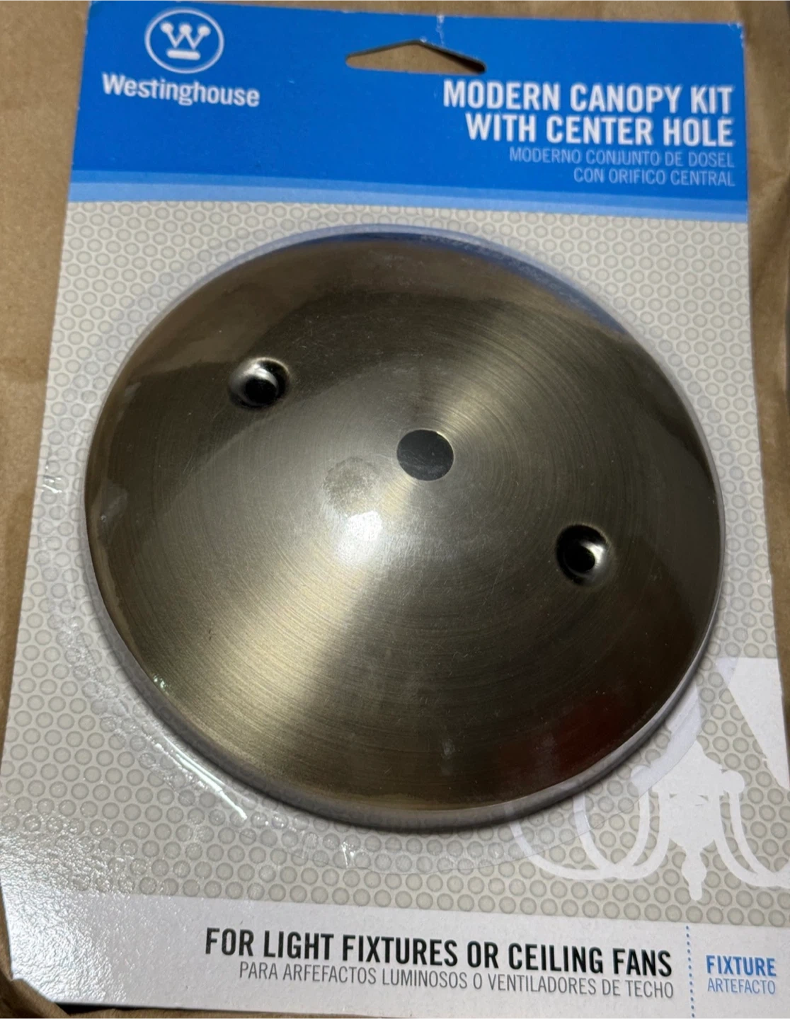 Selling a new Westinghouse modern canopy kit with center hole for light fixtures or ceiling fans. It is still in its original packaging.
