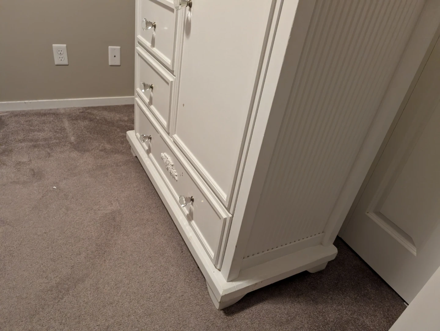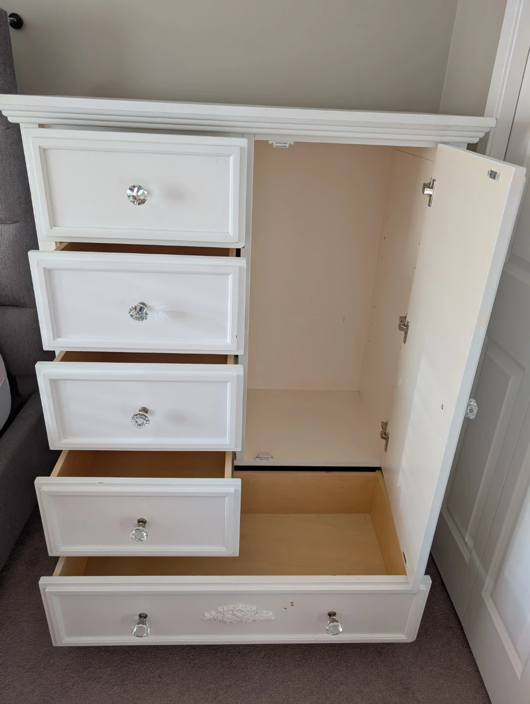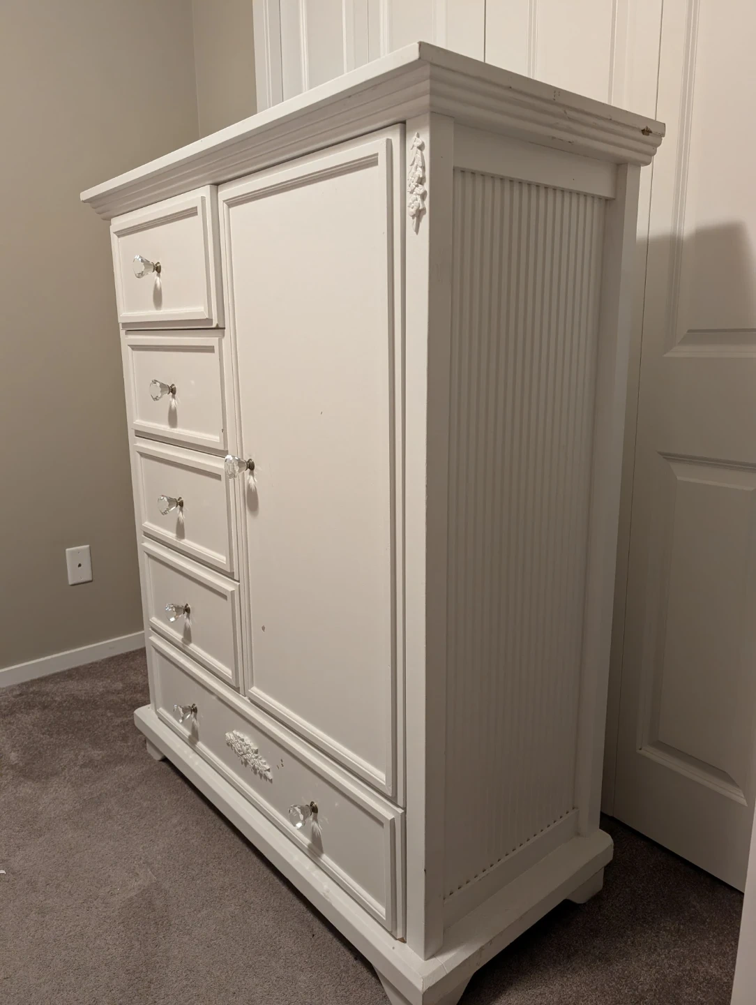 Beautiful white dresser with classic design and crystal-style knobs.