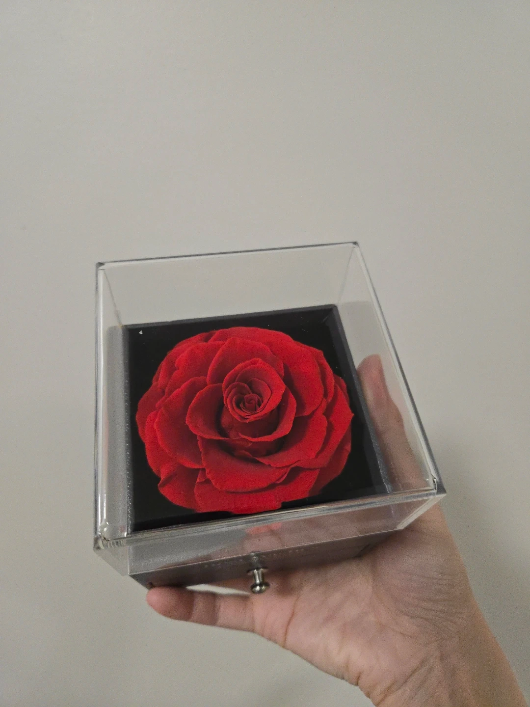 Selling a beautiful preserved red rose in a clear acrylic box! It's brand new and would make a lovely decorative piece. The box has a small drawer at the bottom to put jewelry.