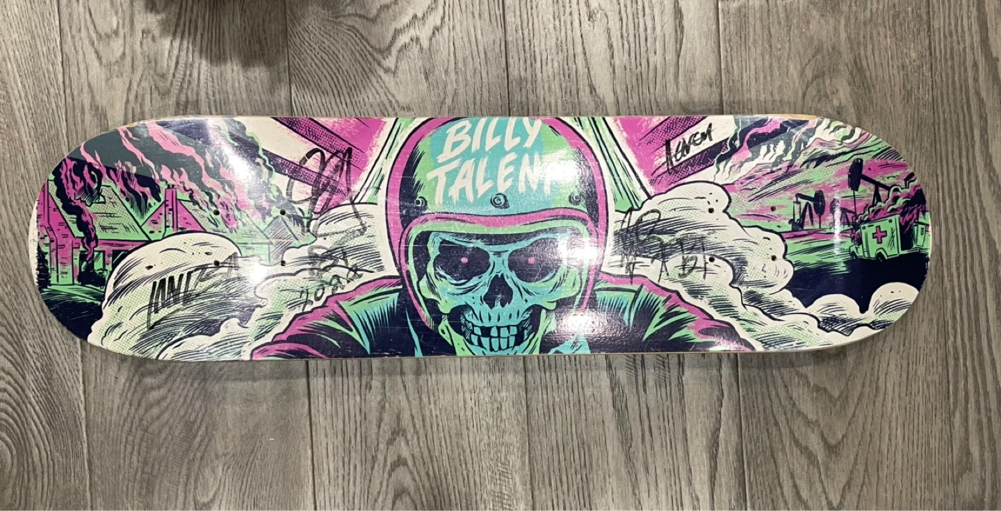 Autographed Billy Talent skateboard deck. It features a unique graphic design and the band members autographs. Perfect gift for skateboard enthusiasts and fans of the band.