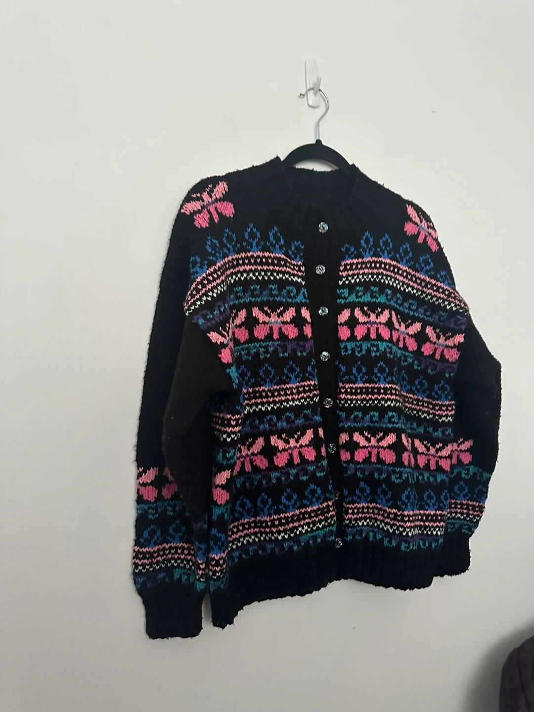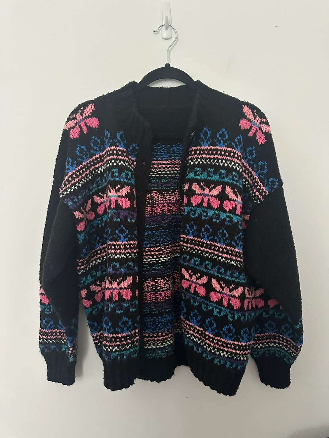 Cozy up in this eye-catching black knit cardigan! It features a colourful patterned design with pink, blue, and purple accents. Perfect for adding a pop of colour to your wardrobe and staying warm on chilly days