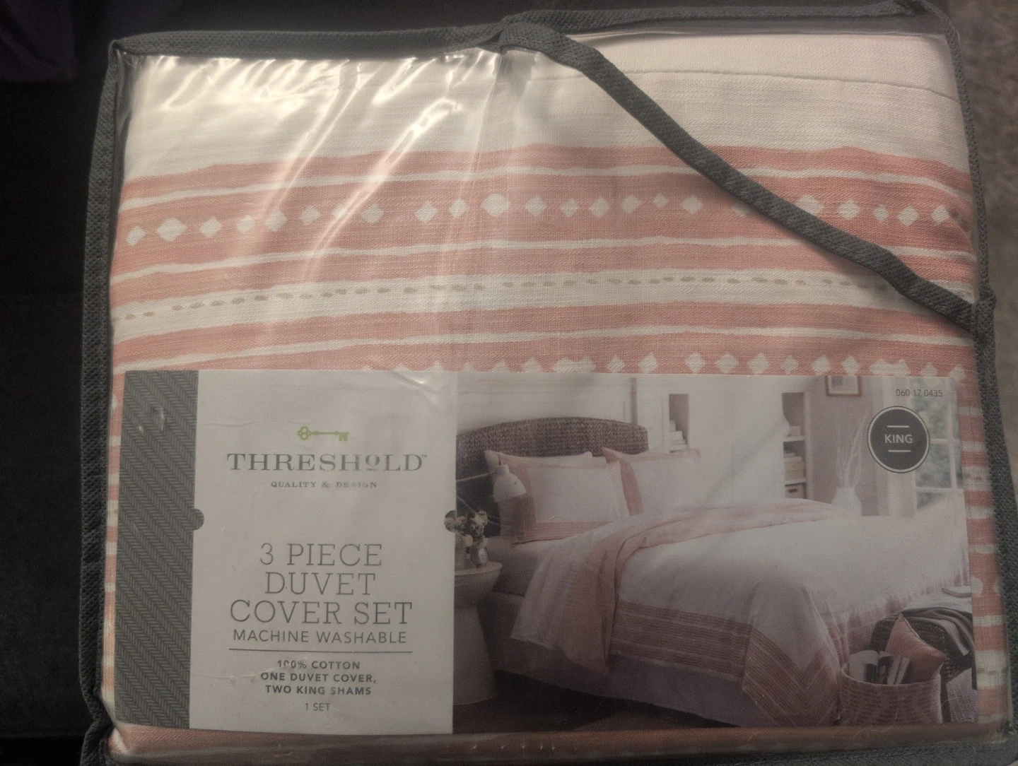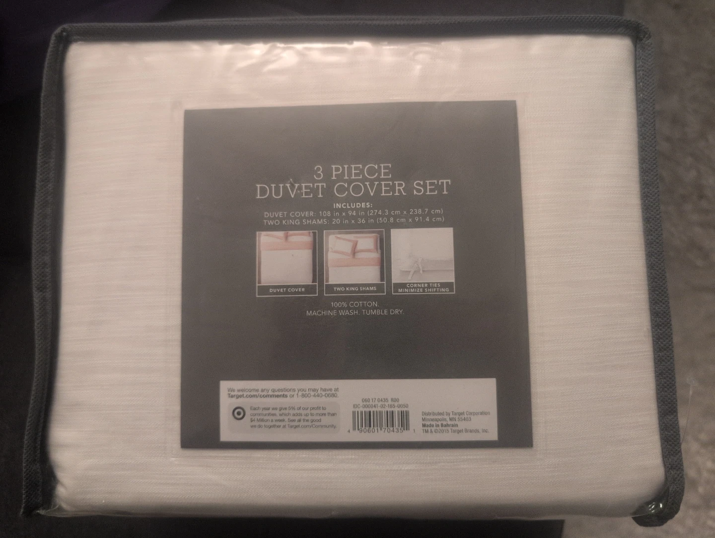Selling a brand new 3-piece duvet cover set in king size! The set includes one duvet cover (108 in x 94 in / 274.3 cm x 238.7 cm) and two king shams (20 in x 36 in / 50.8 cm x 91.4 cm). It's made of 100% cotton and is machine washable and tumble dryable.