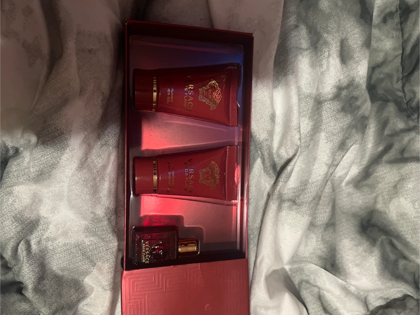 Selling a Versace Eros Flame gift set! It includes a shower gel, eau de parfum, and aftershave balm. The box is included