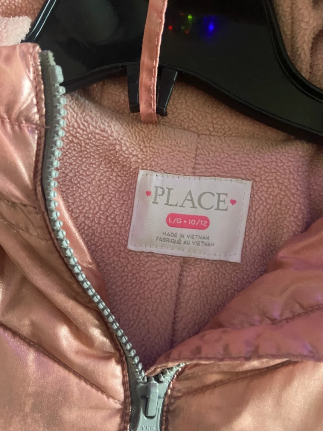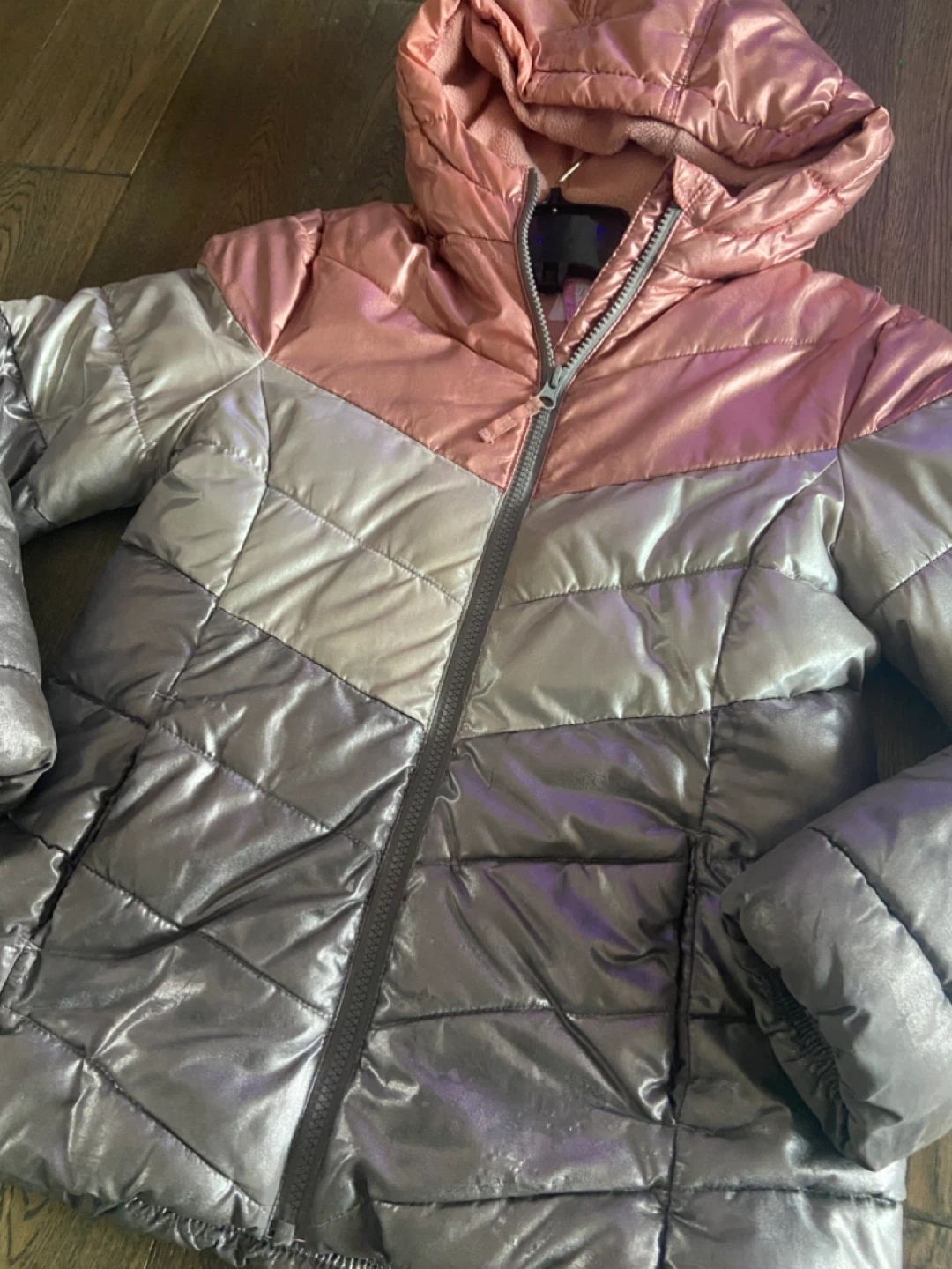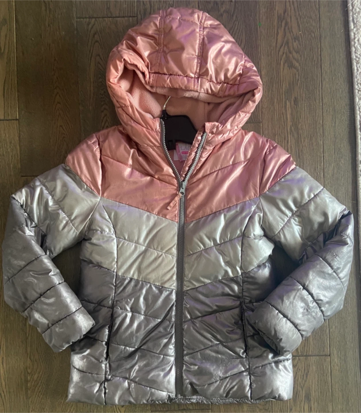 Here's a cute shiny hooded puffer jacket from The Children's Place! It's a size L (10/12) and features a stylish colour block chevron design in silver and pink. Perfect for keeping your little one warm and cozy! Great condition and smk-free. Pick up north end near Linwell/Vine