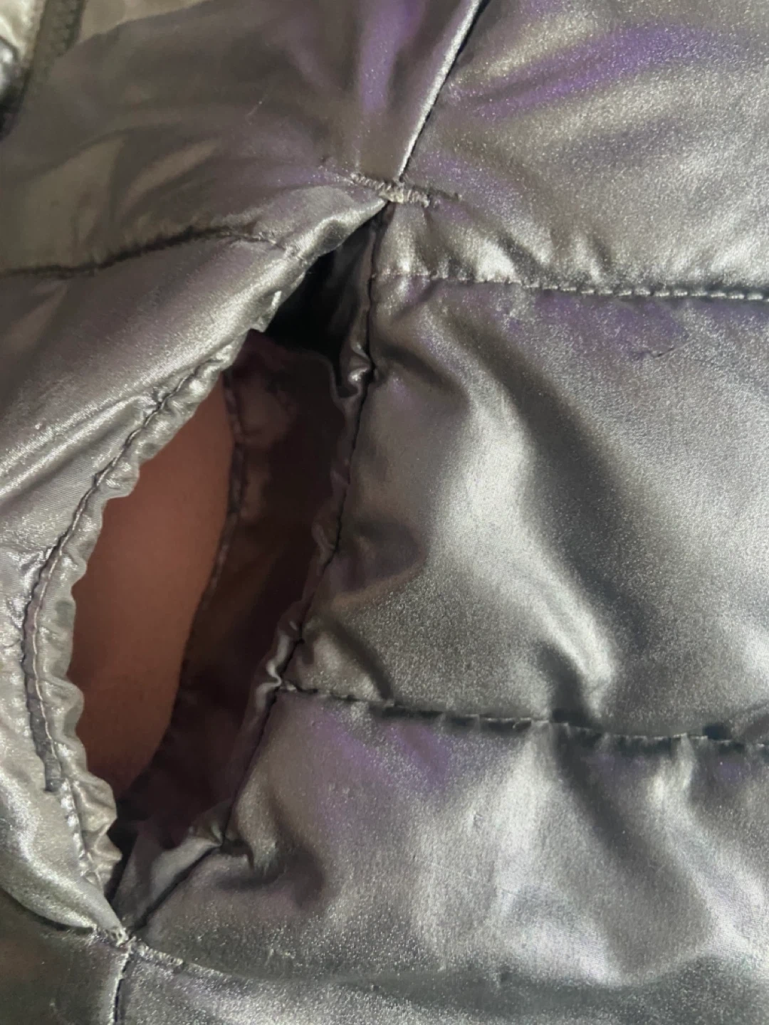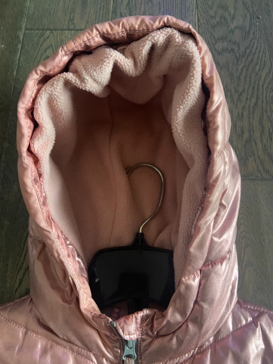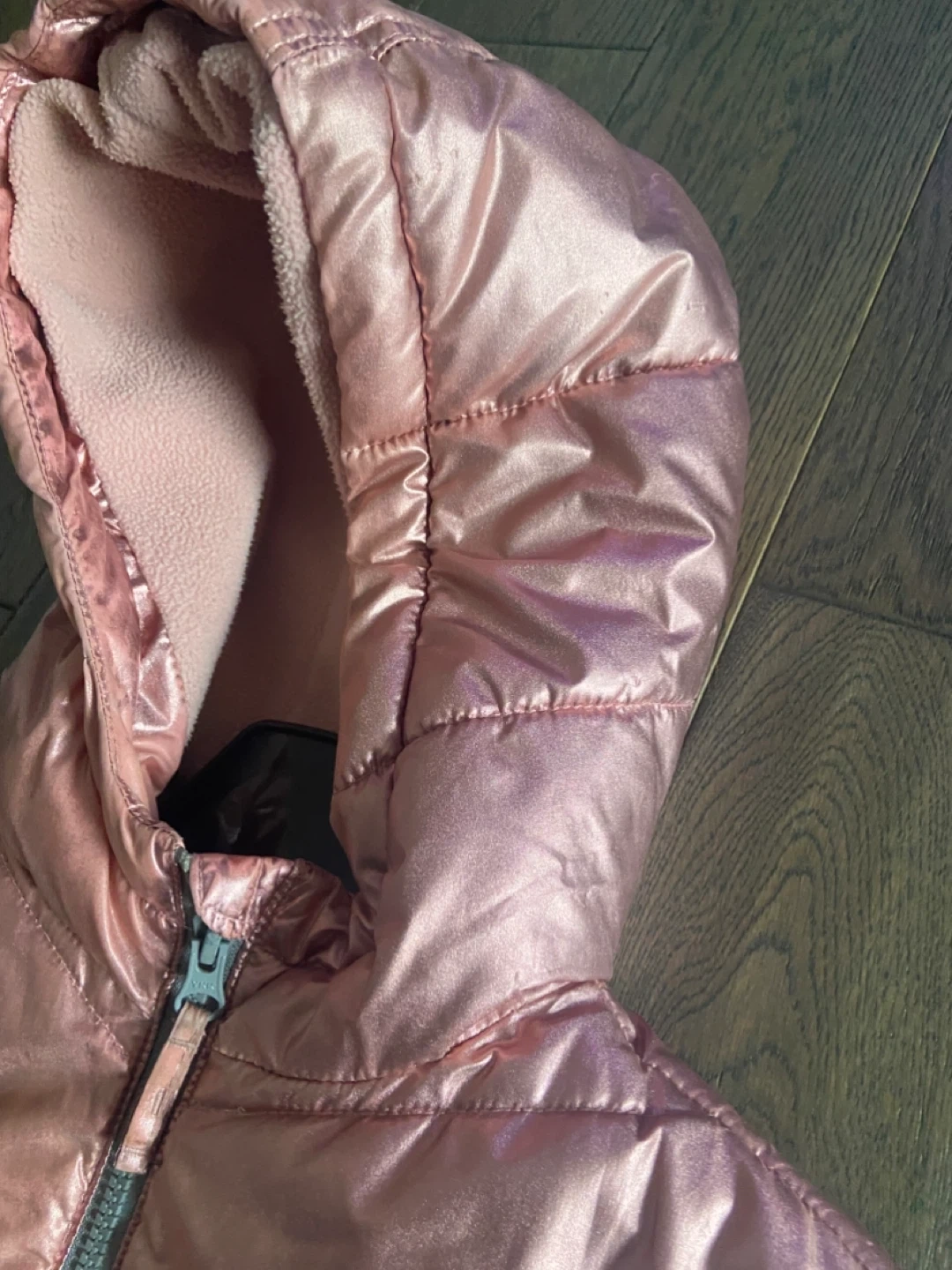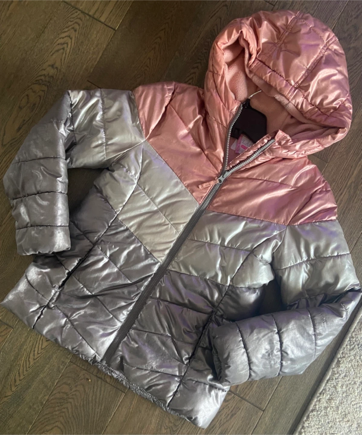 Here's a cute shiny hooded puffer jacket from The Children's Place! It's a size L (10/12) and features a stylish colour block chevron design in silver and pink. Perfect for keeping your little one warm and cozy! Great condition and smk-free. Pick up north end near Linwell/Vine