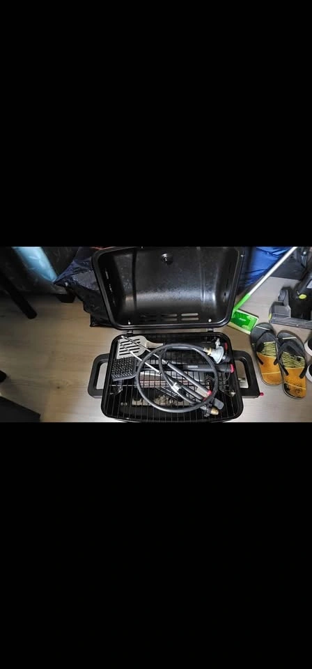 Small Canadian tire bbq with hose for large tank and bbq utensils included clean and well maintained $50