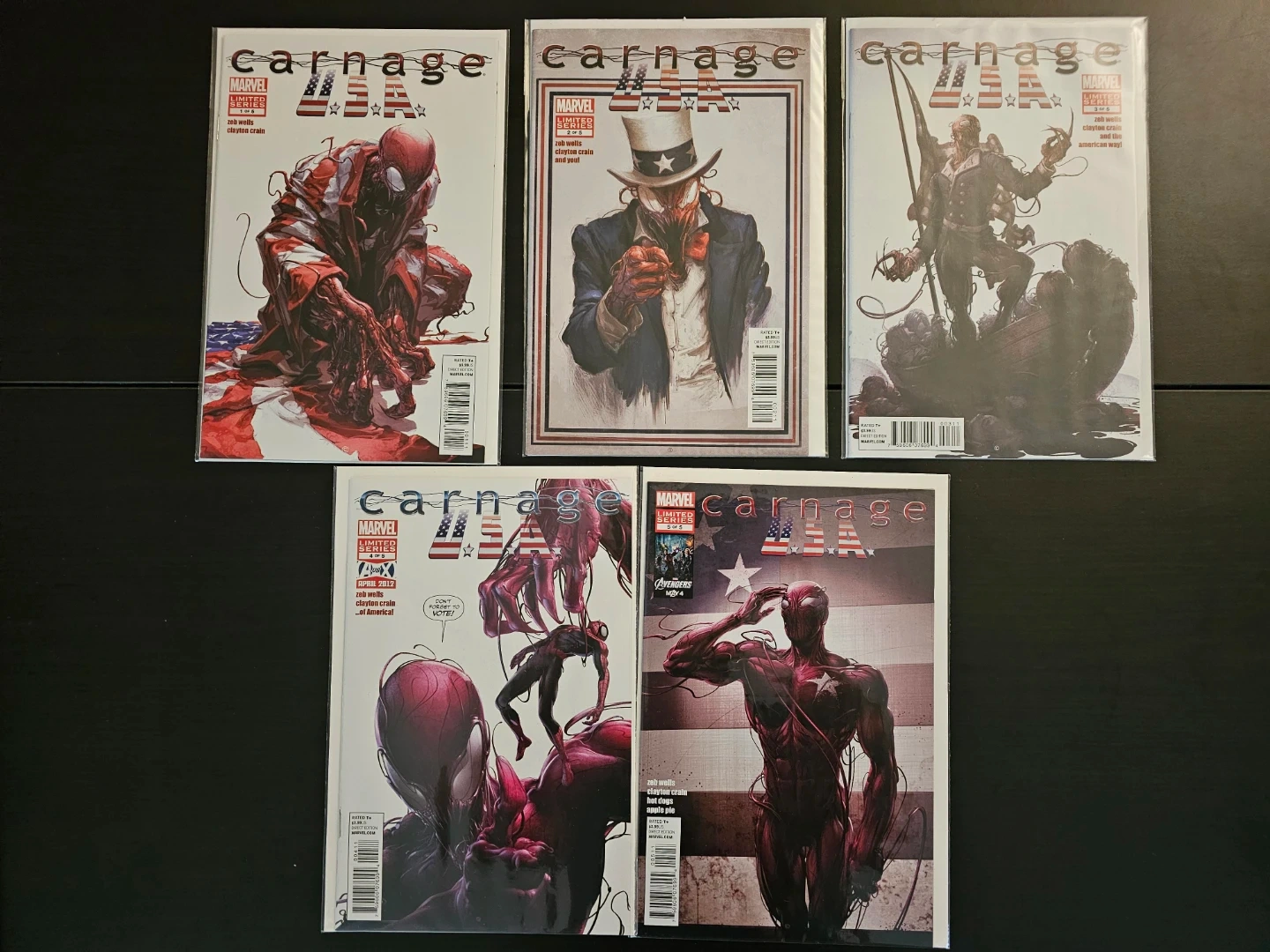 Up for grabs is a complete set of Carnage USA comics, issues 1-5! These comics are in used condition, showing some wear and tear, but are still very readable and displayable. Perfect for any collector or fan of the Carnage character! These comics have been kept in a smoke free home.