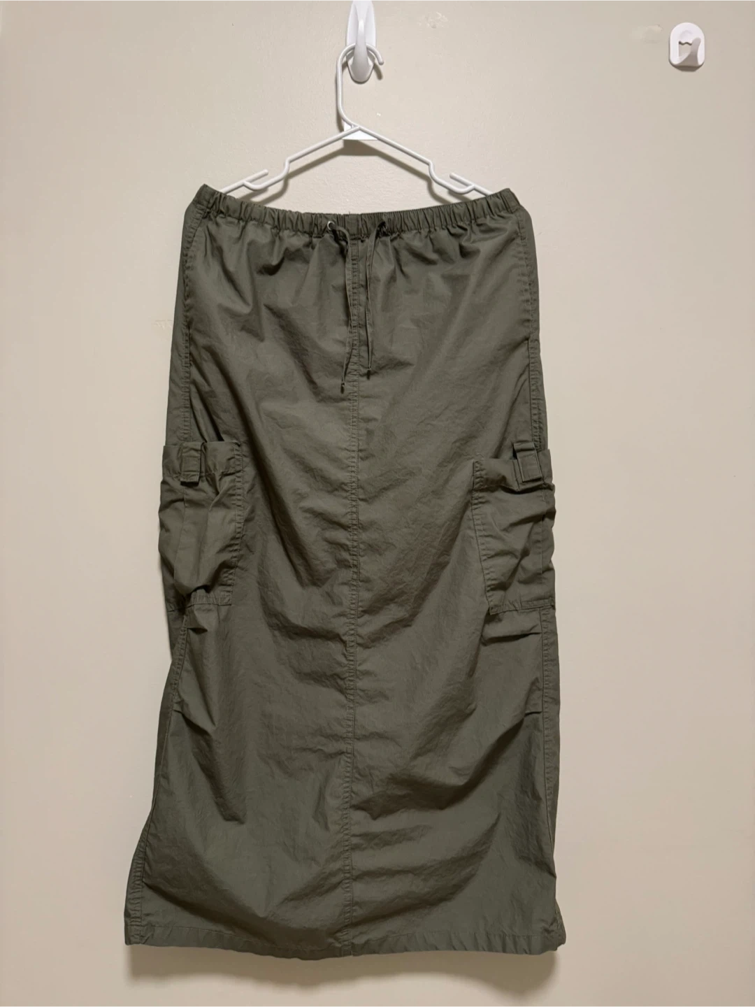 Here's an olive green cargo skirt! It has a drawstring waist and pockets on both sides. Perfect for a casual look!