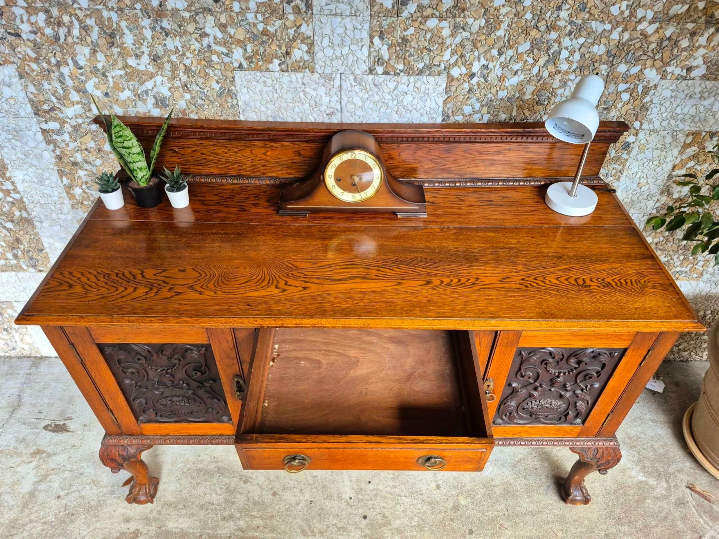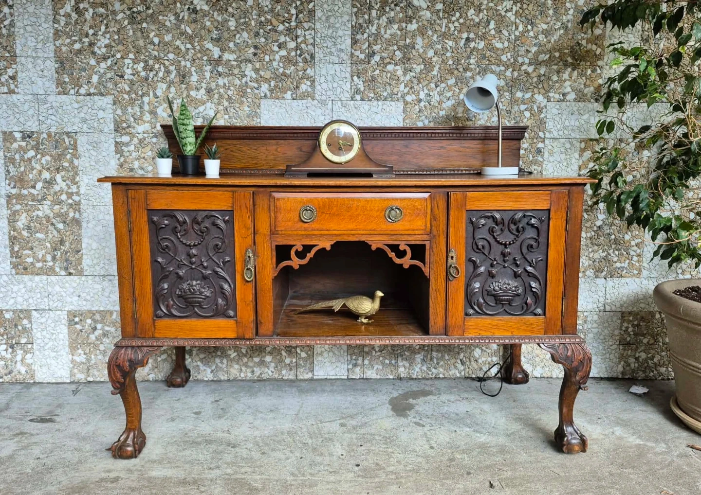 Beautiful antique solid wood sideboard featuring rich wood tones intricate carved panel doors and elegant claw feet.