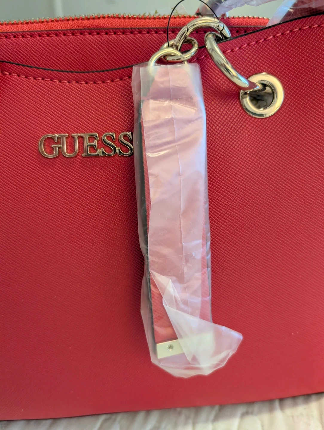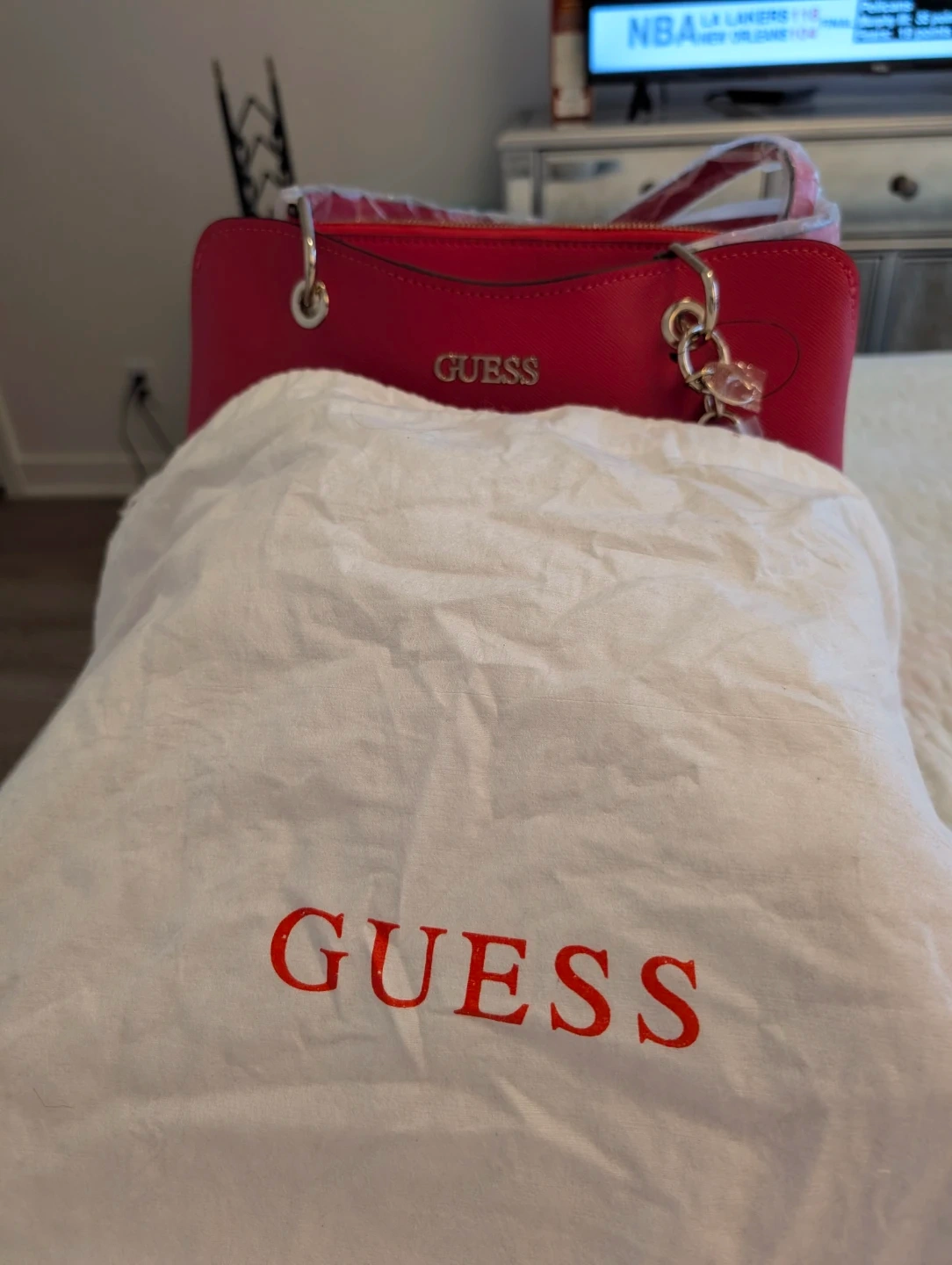 Selling a brand new Guess handbag in a vibrant red colour! It comes with its original dust bag to keep it protected. The bag features a stylish chain and the iconic Guess logo. Never been used!