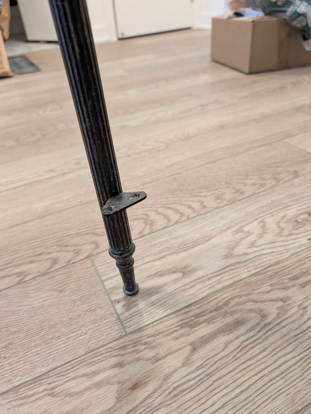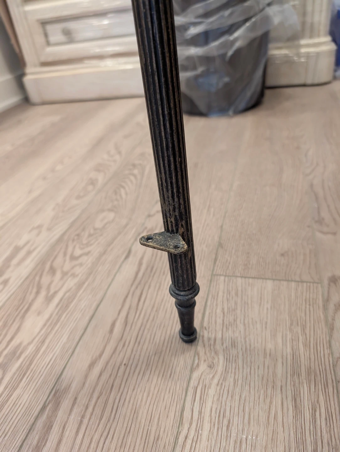 This is a cute round side table with a mosaic tile top and a lower glass shelf. It has black metal legs. It would look great in any room!