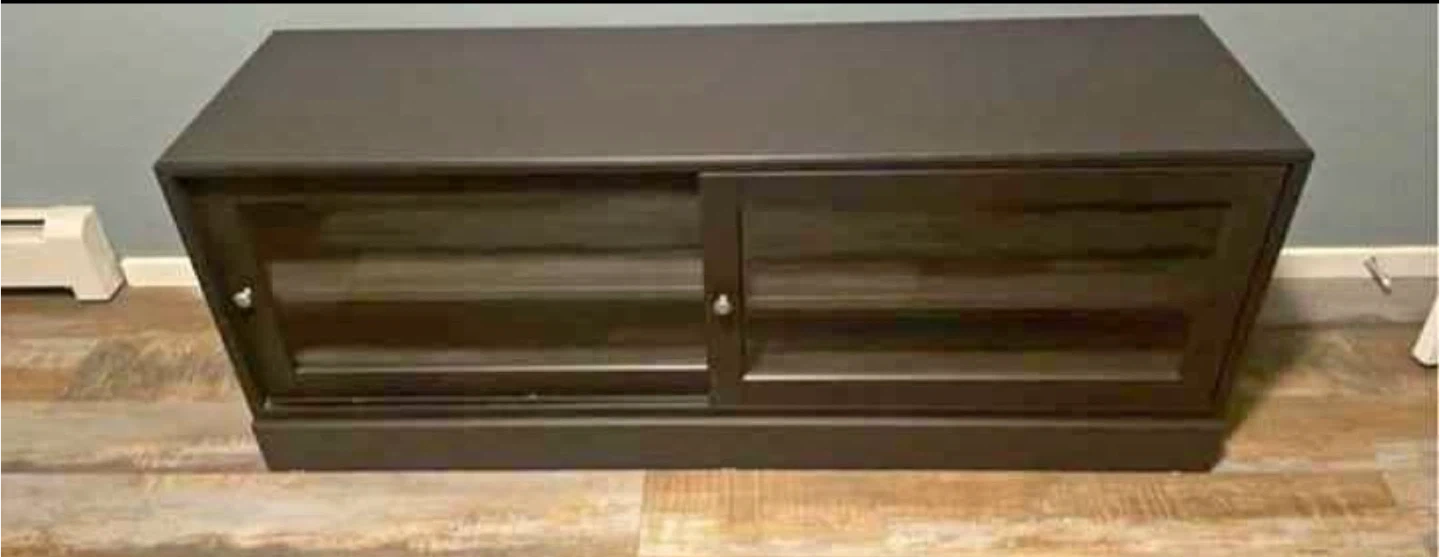 Selling a dark brown media console. It has sliding doors and shelves for storage. Perfect for a living room or entertainment area!
