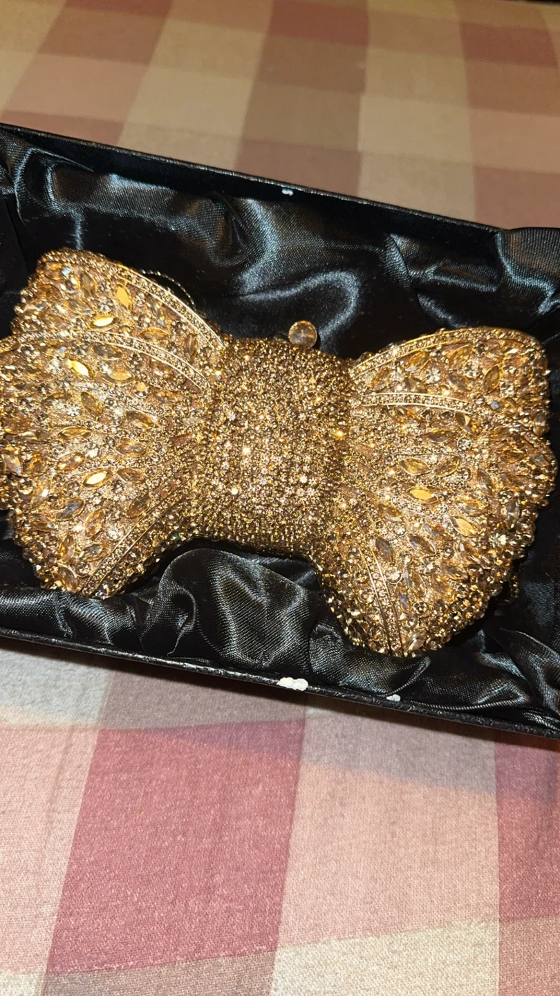 Selling a beautiful gold bow clutch! It's in great condition and comes with its original box. Perfect for a special occasion or to add a touch of sparkle to your outfit. Used once and kept in original packaging.