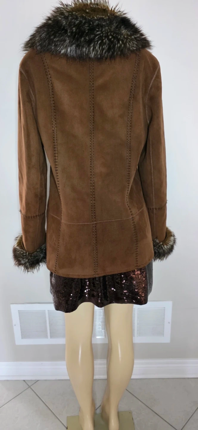Here's a stylish brown jacket made of faux suede material. It features a fur trim around the collar and cuffs, adding a touch of elegance. It has a button-up closure and is in great condition! Very unique peice!