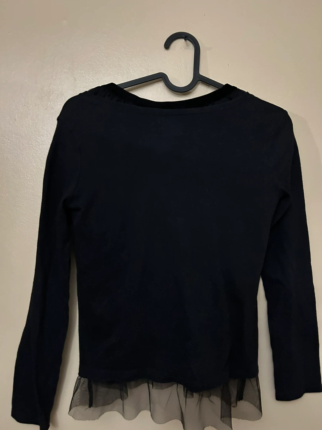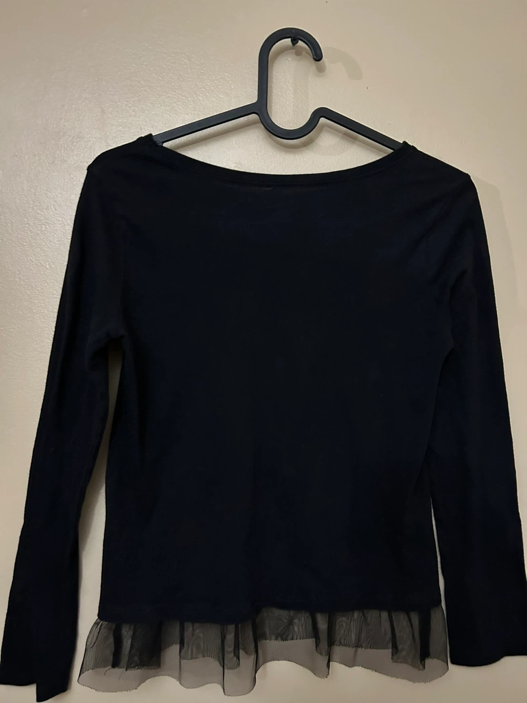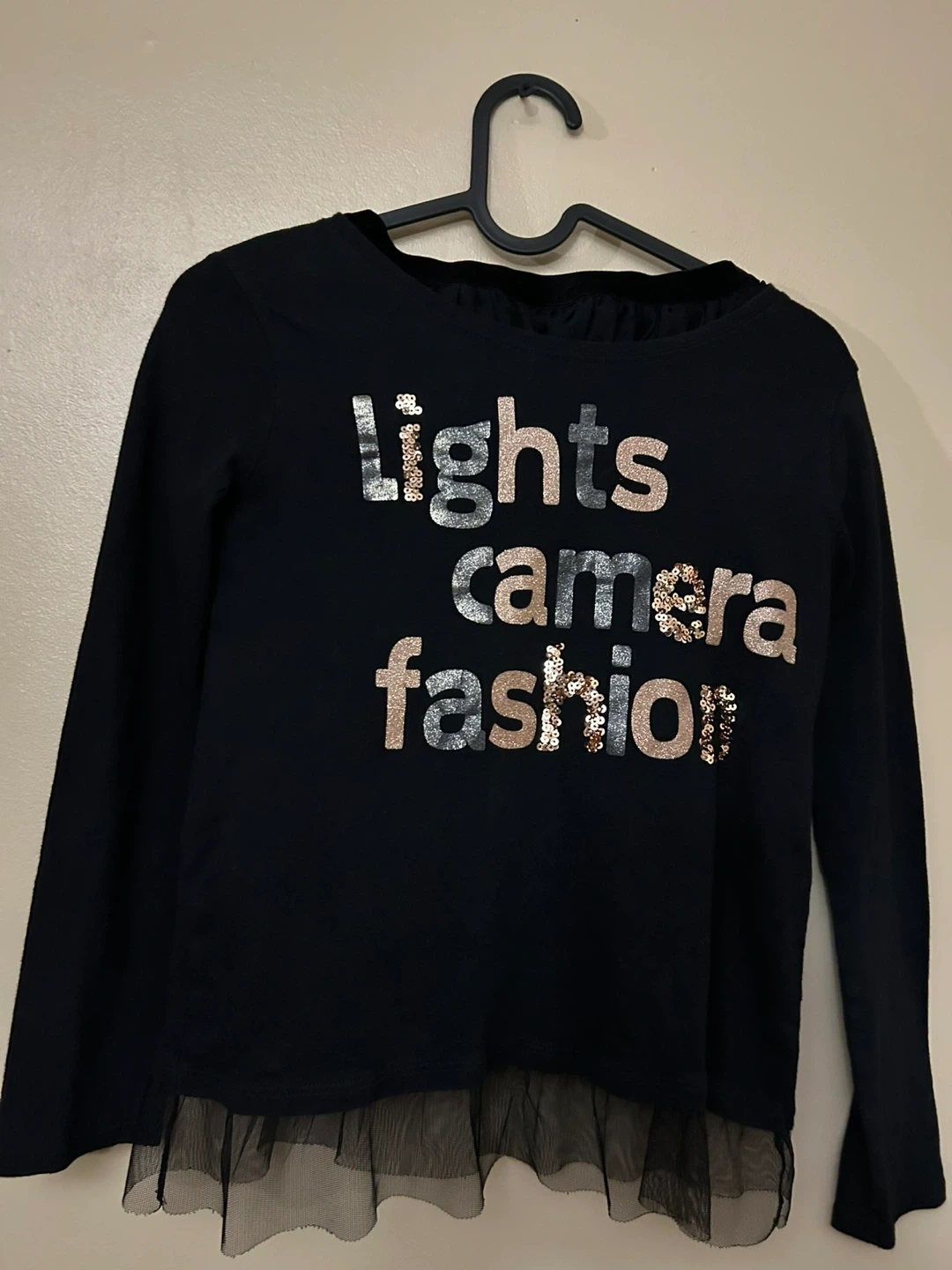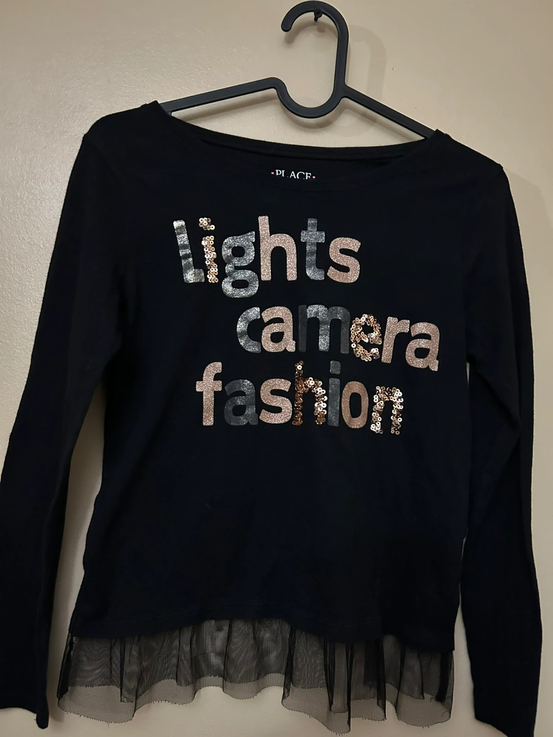 This is a Children's Place girls' black long-sleeve top featuring 'lights camera fashion' in gold and silver sequins with a decorative mesh hem, perfect for adding some sparkle to her wardrobe; note that it is in used condition.
