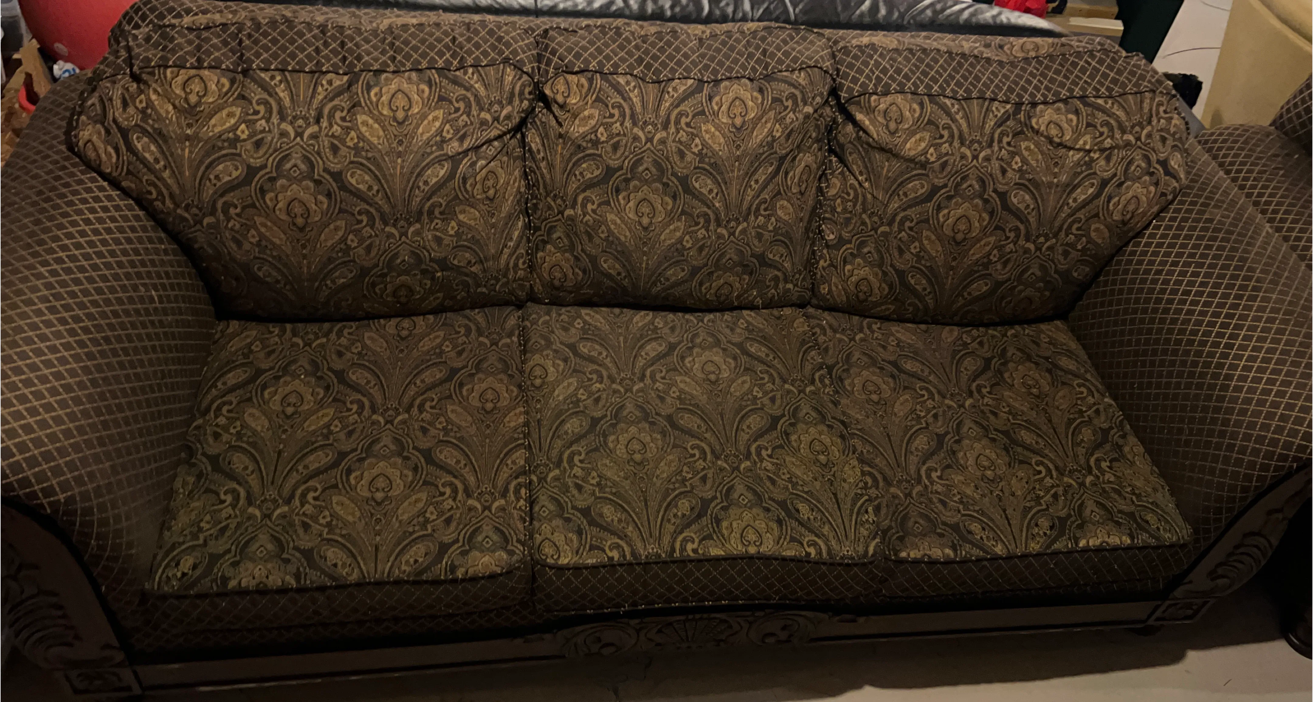 Here's a comfy sofa with a lovely brown pattern! It's perfect for adding a touch of elegance to your living room. It's in good condition and ready for a new home