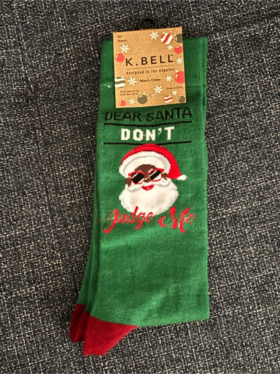 Here are some fun K. Bell men's crew socks! They're green with a red cuff and feature a 'Dear Santa Don't Judge Me' design.