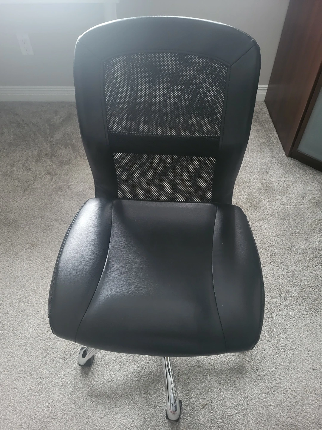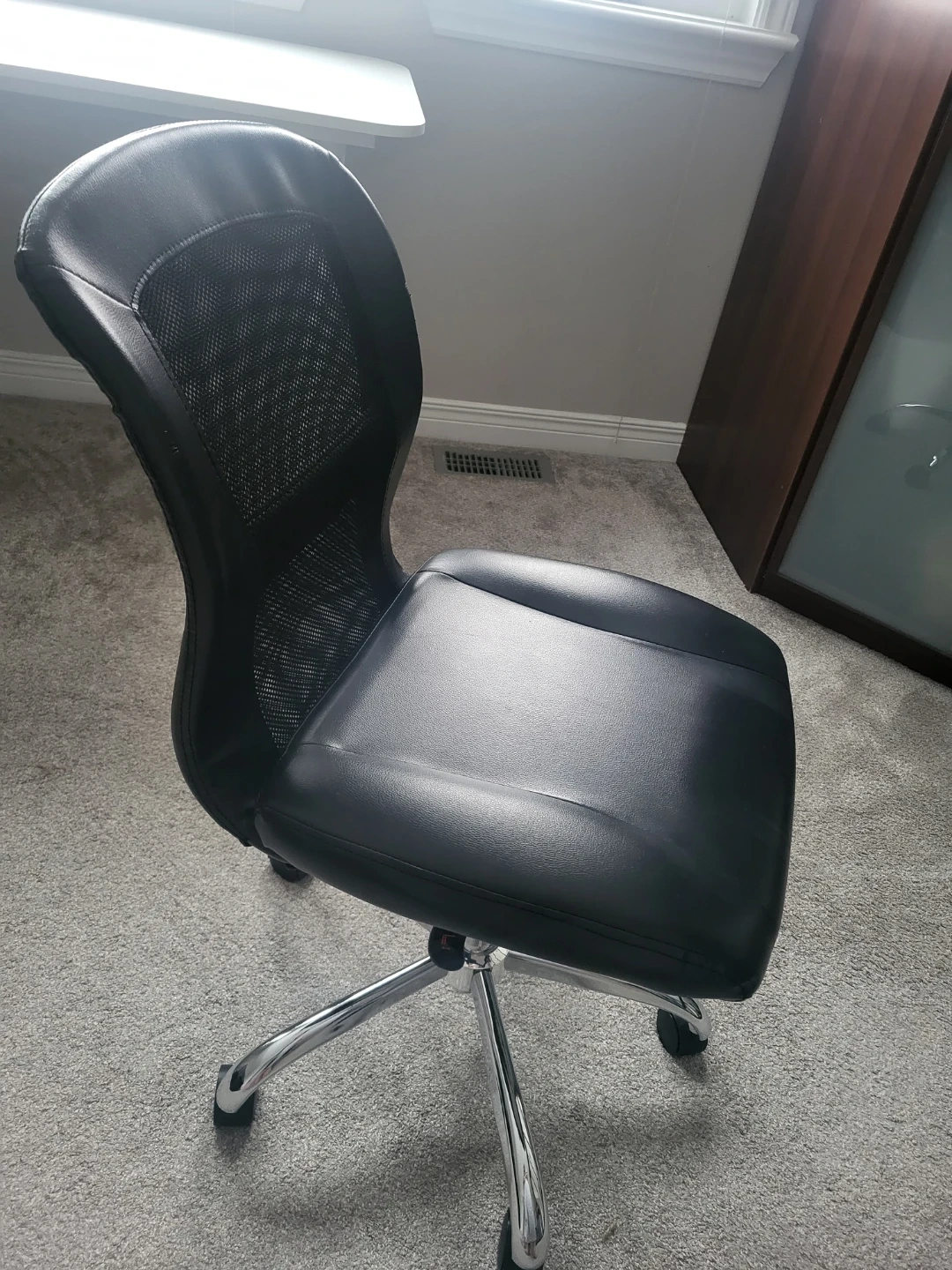 Selling a comfortable black office chair! It features a mesh back for breathability and a padded seat for those long work sessions. It's in good condition and ready to use in your home office