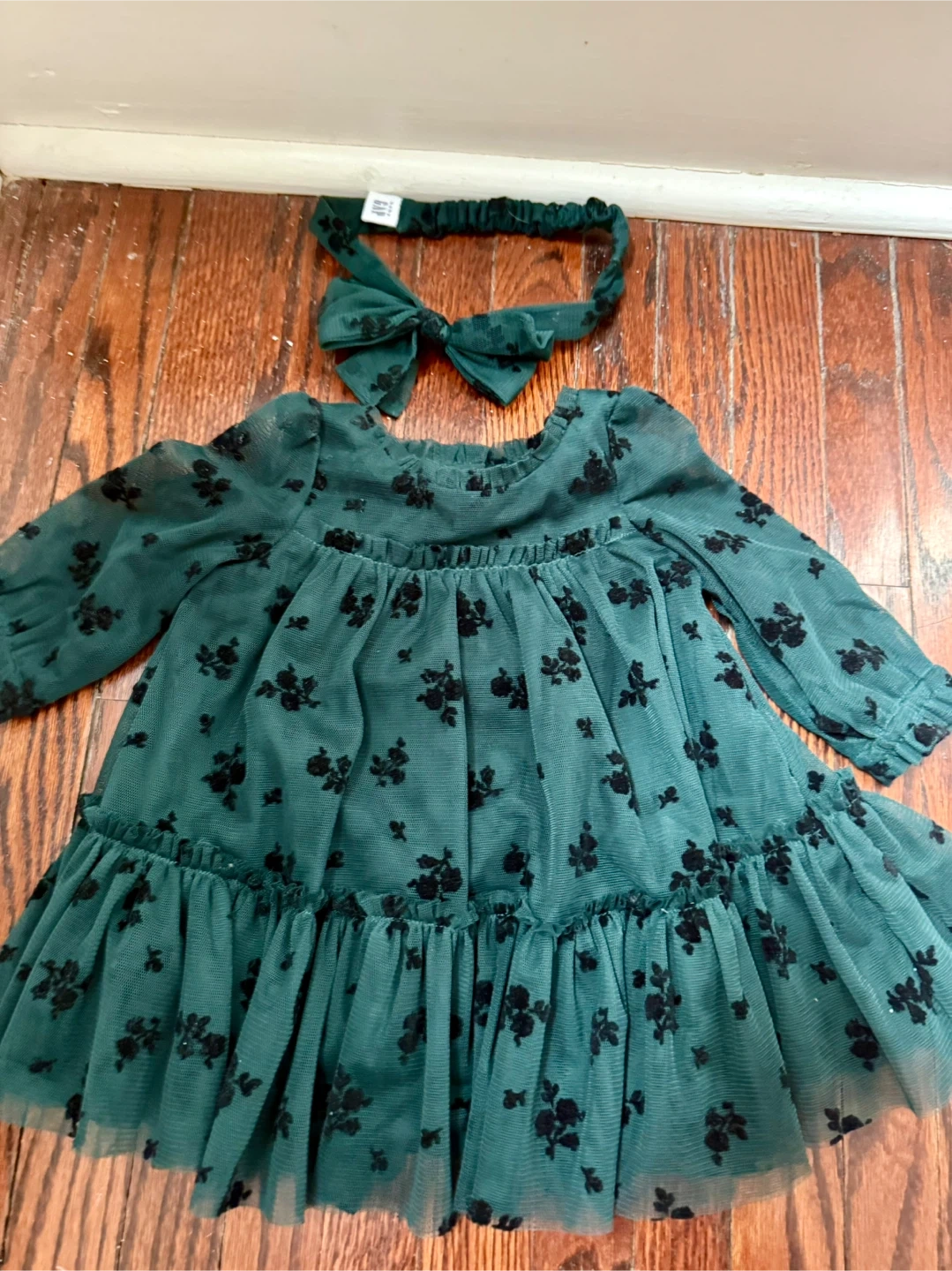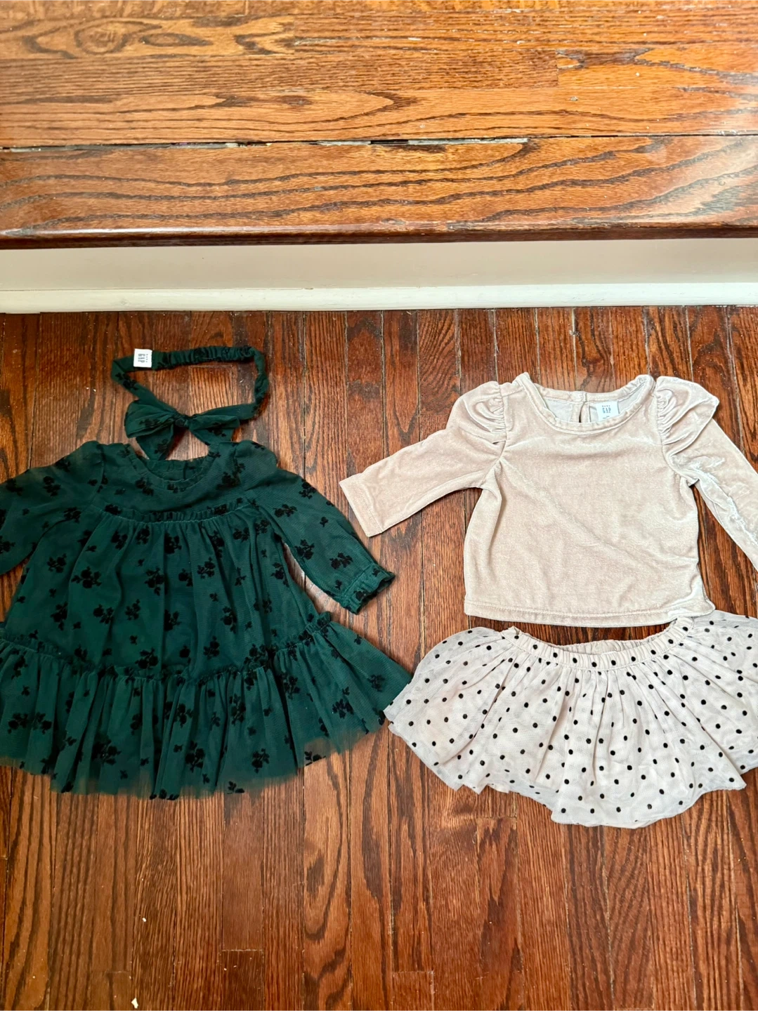 Baby Gap holiday sets, size 6-12mts. Includes a velvet top with polka dot skirt and a green floral dress with a matching headband. Only worn once! $15 each or $25 for both.